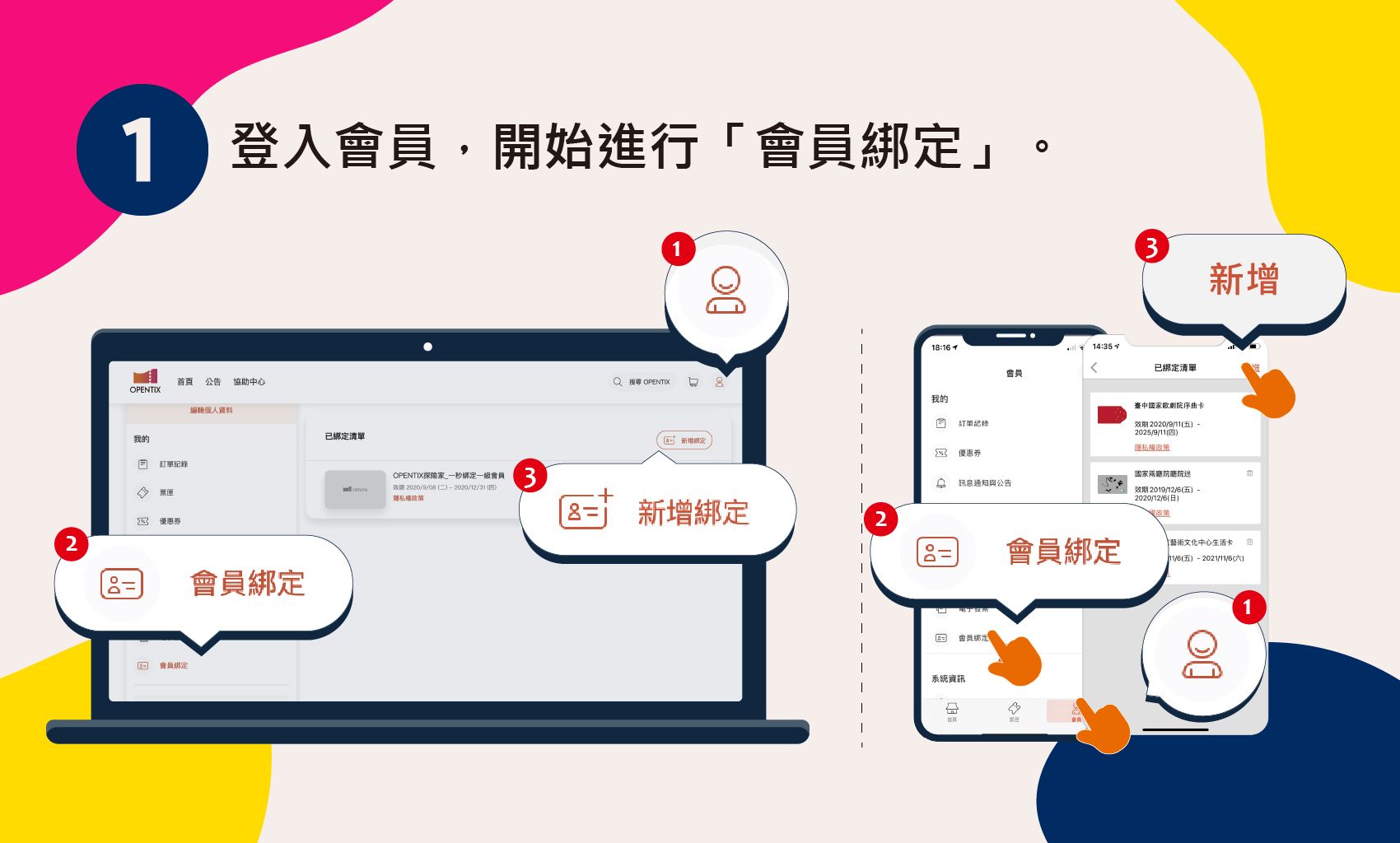 Step1. 登入OPENTIX會員,並按照以下三步驟,新增「會員綁定」。