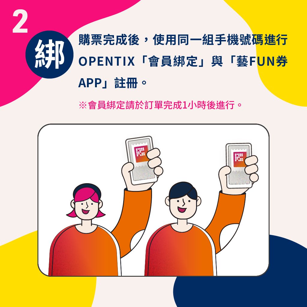 購票完成後,請記得使用同一組手機號碼進行OPENTIX「會員綁定」與「藝FUN券APP」註冊。
