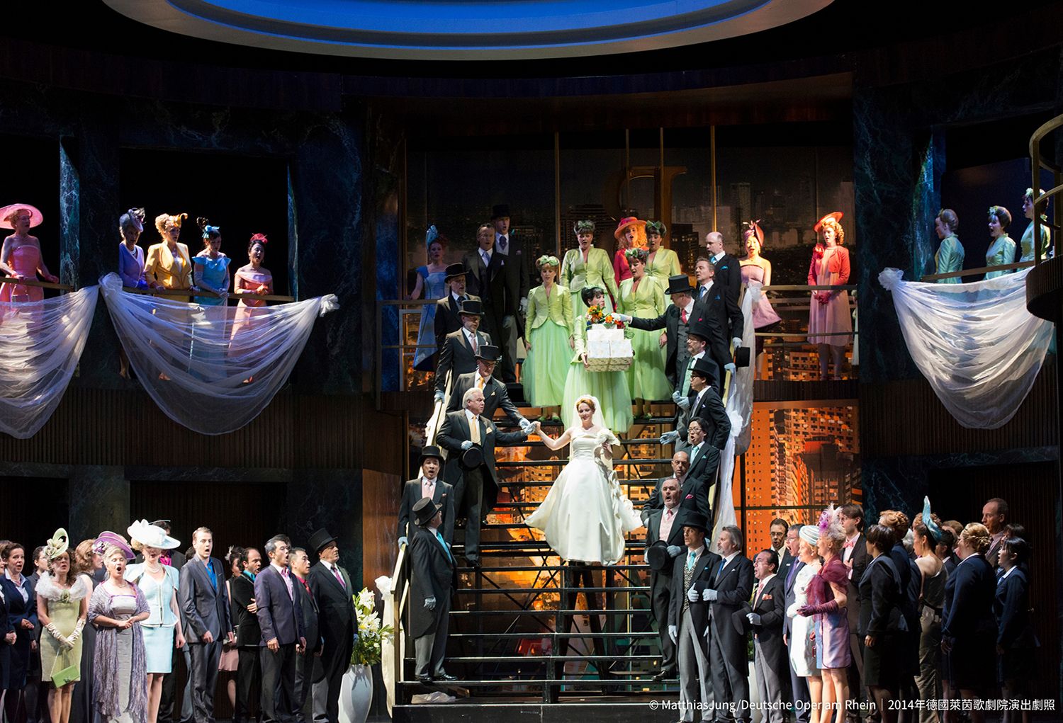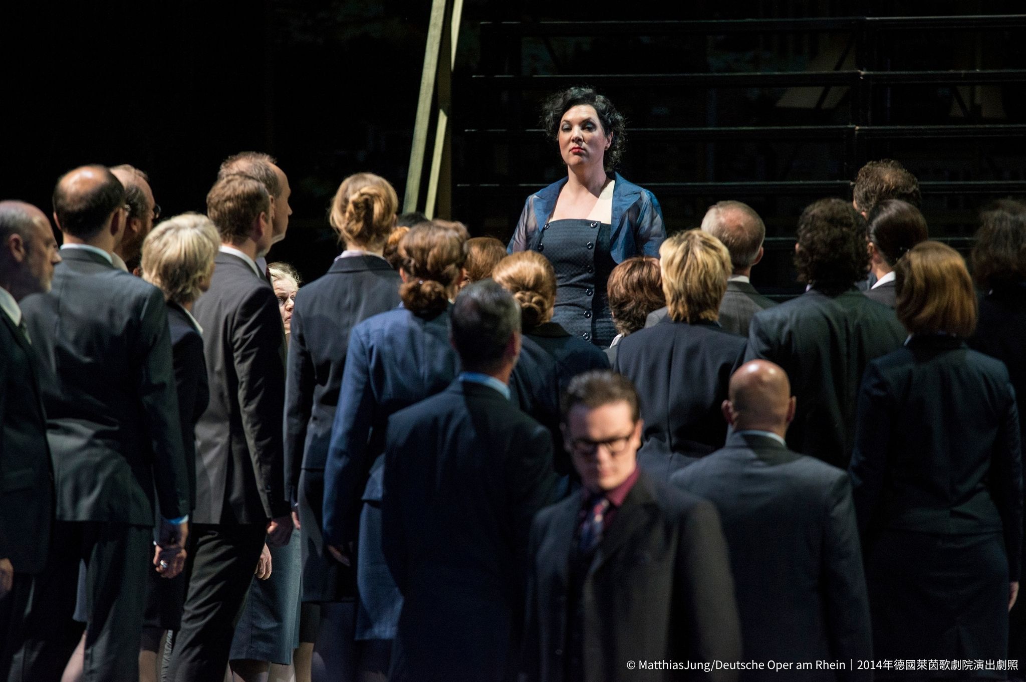有了前面鋪陳,我們再來這次九月將在衛武營呈現的《羅恩格林》,就變得非常有趣。這個製作是2014年杜塞道夫萊茵歌劇院的版本,也是簡文彬來衛武營擔任總監前,在德國工作的萊茵歌劇院,他所指揮的最後一齣歌劇。這個版本同樣關切一個問題,就是改變一切的力量到底是甚麼?當年出現雷曼兄弟倒閉與華爾街金融危機,成為導演詮釋的靈感來源,金錢就是劇中人物彼此在爭奪的力量,資本就是聖杯。所以演出一開始,有人在外面抗議,整齣戲就變成一家面臨破產的銀行,如何接受一位神秘客拯救,起死回生的故事。