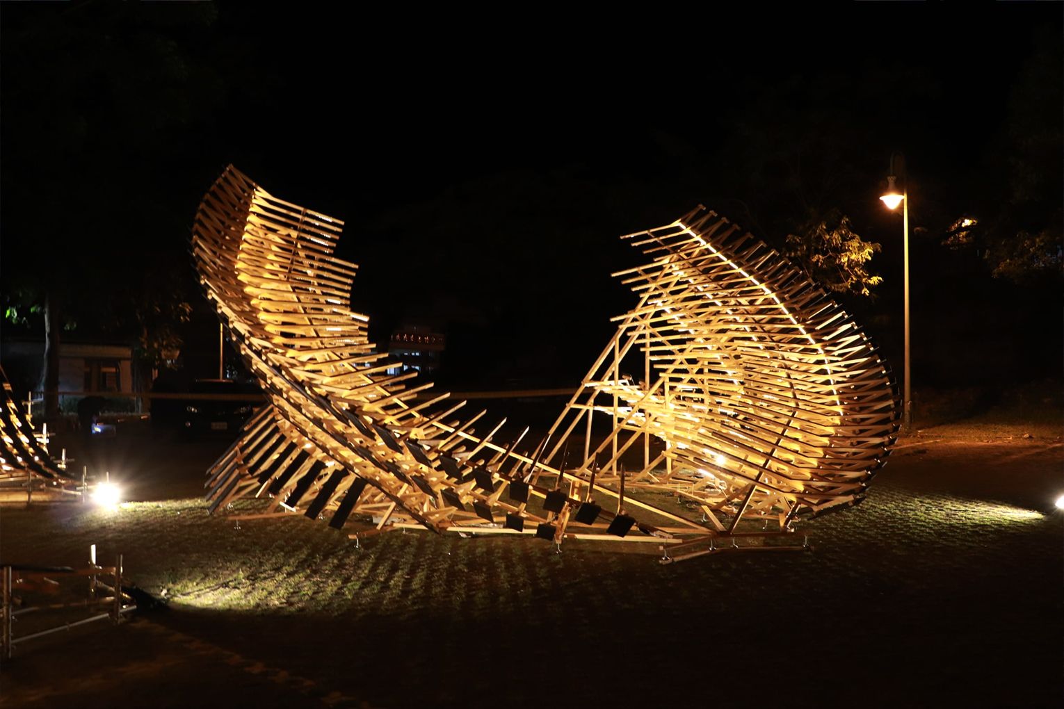 《凰火燼生》這個作品採用的媒材為碳化木板、木材、金屬、軟性霓虹燈條與地燈,藝術家彭冠銘的作品多以機械結構與精密零件為基礎,透過單元複製的組構語彙,探討結構背後所產生的行為意象,並且擅長參數式設計將虛擬曲線上的節點透過演算法相連,使抽象的情感轉化為可見的立體結構。 彭冠銘希望透過作品中「碳化木板」的意象去回應龍崎地區竹炭發展的歷史——坐落於台南龍崎的虎形山,由於特殊的惡地地形,難以發展特色的經濟作物;但居民以山區豐富的竹林生態為本,發展出獨有的竹炭產業,也透過竹炭產業重新帶來經濟及資源,因此彭冠銘以《凰火燼生》為名,將鳳凰的翅膀作為意象,透過周而復始的圓弧造型呈現,在每次的餘燼之後,都能重燃振翅的希望,期待以《凰火燼生》裝置作品為起點,開啟龍崎居民及來往民眾的生機。