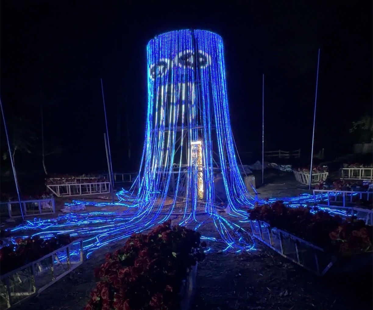 這次的主燈《山林呼喚》由臺南在地藝術家潘奕丞操刀。其創作多利用普普藝術的圖像元素,探討性、性別、多元關係,2018年繪製第一幅童年馬賽克作品受到廣大迴響後,開始發展系列作品,也加入AR、VR等互動模式進入作品。 在此脈絡裡,《山林呼喚》是件融合數位藝術與自然景觀的裝置作品,透過LED燈條的視覺語彙,營造出如同山中精靈在呼喚的氛圍。作品中央的流動影像運用柔和、卻神秘的光影律動,展現出精靈的眼神與表情,引導觀眾踏入一場奇幻旅程,去傾聽大自然深處的聲音。 河流前方排列的木船中盛放著花朵,象徵著祝福與生命的延續。每艘船像是大自然傳遞的信使,隨著光線的流動而散發出神聖與溫暖的氣息。花朵與木船相互交織的視覺效果,彷彿將觀眾帶入山林與河川之間的對話場域,呼應著整個展覽的精神主題——人與自然、藝術與科技的共生。 草地上的LED燈條宛如溪流般蜿蜒流動,透過數位媒體的創新手法,詮釋水的靈動與森林夜晚的微妙光影變化。這種設計不僅強化了作品的視覺張力,也象徵著萬物之間潛在的連結與流動。整個空間以流動的光為語言,搭配森林的夜色與遠方星空,將觀者包圍於一種既現實又夢境的體驗之中。