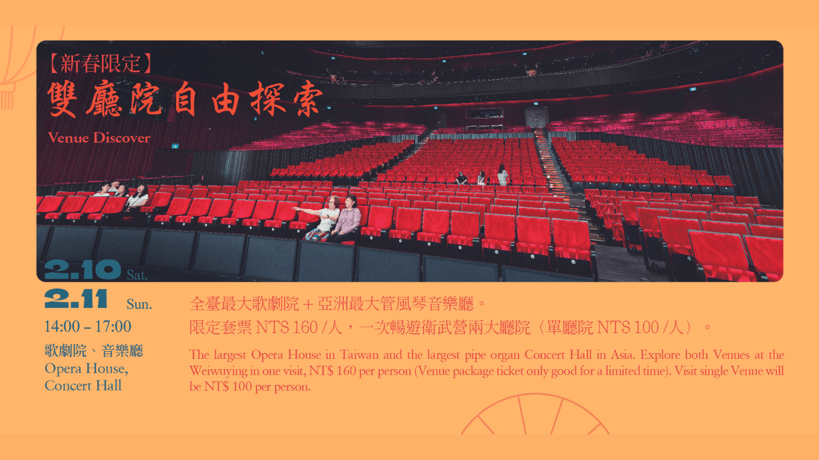 廳院自由探索特別推出新春限定場,初一初二連續兩天同時開放兩廳院入內參觀,以紅色作為代表的衛武營歌劇院跟擁有衛武營鎮館之寶管風琴的音樂廳,讓您一次大飽眼福欣賞兩個廳院,套票優惠$160/人(原價$200/人)。