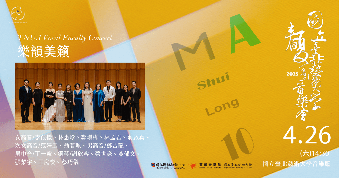 同時也將呈現橫跨中西的藝術歌曲與歌劇選曲,包含李硯、黃自、游昌發,以及德沃札克、馬斯內、拉赫瑪尼諾夫、杜帕克、拉森等作曲家的經典之作,展現北藝大聲樂組教授的詮釋實力與多元風貌。