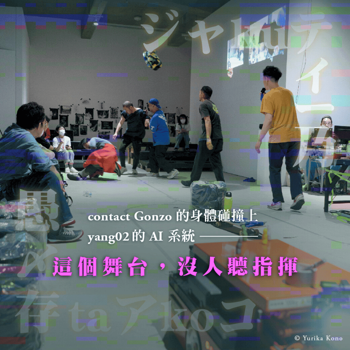 日本行為藝術團體 contact Gonzo 與藝術家 yang02 於2023年共同創作全新作品《jactynogg zontaanaco ジャkuティー乃愚・存taアkoコ》,靈感來自雙方2019年合作的《untitled session》。本作揉合了contact Gonzo擅長的即興身體接觸表演,以及yang02所製作的自走式機械裝置——一部能以影像識別與語言輸出方式「轉譯」演出內容的AI系統。這部作品以AI的「圖像字幕生成」機制為基礎,試圖將即興演出影像轉譯為語言,再由機器語音朗讀。當身體被AI辨識(或誤識),產生語言描述與實際動作之間的落差與偏差。作品以輕盈幽默的語調,揭示當代社會中AI、身體與語言三者之間錯綜複雜的關係,並挑戰觀眾對「翻譯」的想像——尤其當對象是變化無常、難以預測的人體。