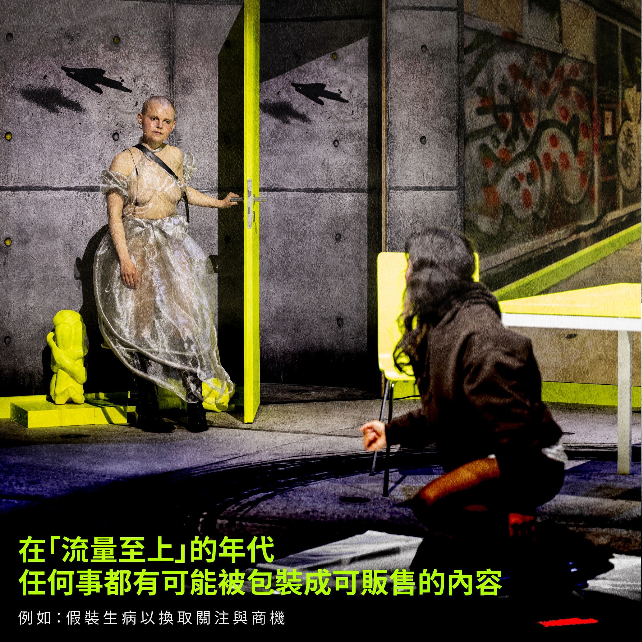 德國導演蘇珊娜.甘迺迪( Susanne Kennedy )與視覺藝術家馬庫斯.塞爾格( Markus Selg )聯手打造劇場革新之作,透過面具與唇形同步(Lip-synching)的表演手法,將台詞預先錄製、經過處理,讓演員僅是在舞台上準確對上口型,這種刻意的「身聲分離」,直接瓦解了我們習慣的、那個內外統一、情感真實的「角色」;在這裡,角色可以是沒有動機的,它更像是一個被媒介操控的介面、一個失去內在聲音的軀殼。
