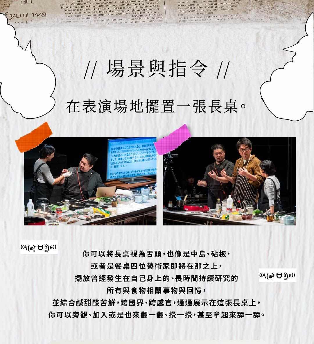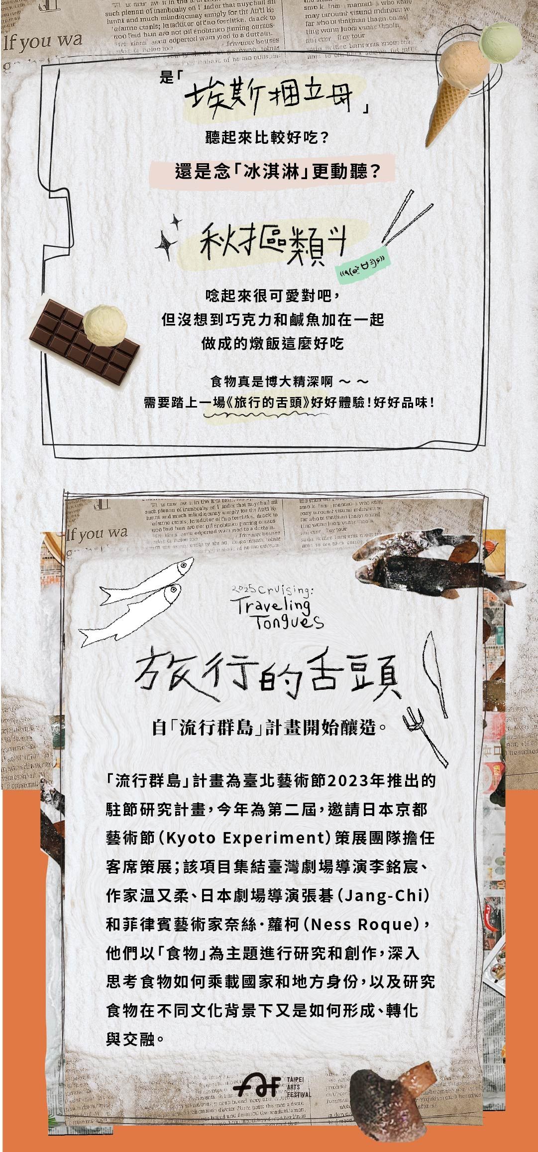 Cruising: Traveling Tongues was first conceived during the "Cruising" initiative, a residency research program launched by the Taipei Arts Festival in 2023 and now entering its second year. This year, we invited the curatorial team from Kyoto Experiment as guest curators. The project brought together Taiwanese theater director Lee Ming-Chen , Taiwanese-Japanese writer Yuju Wen, Japanese theater artist Jang-Chi, and Filipino performer and dramaturg Ness Roque. Together, they embarked on a collaborative exploration with food as their central theme—investigating how it embodies national and regional identities, and how culinary traditions are shaped, translated, and hybridized across cultural contexts.