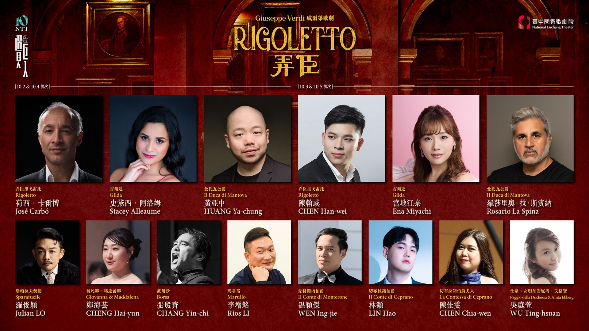 2025 NTT遇見巨人—威爾第歌劇《弄臣》10/3(五)、10/5(日)場次原飾演曼托瓦公爵 (Il Duca di Mantova)之男高音史蒂芬.科斯特洛(Stephen Costello),因健康因素 無法參與本劇演出,該角色異動為男高音羅莎里奧.拉.斯賓納(Rosario La Spina) 飾演。