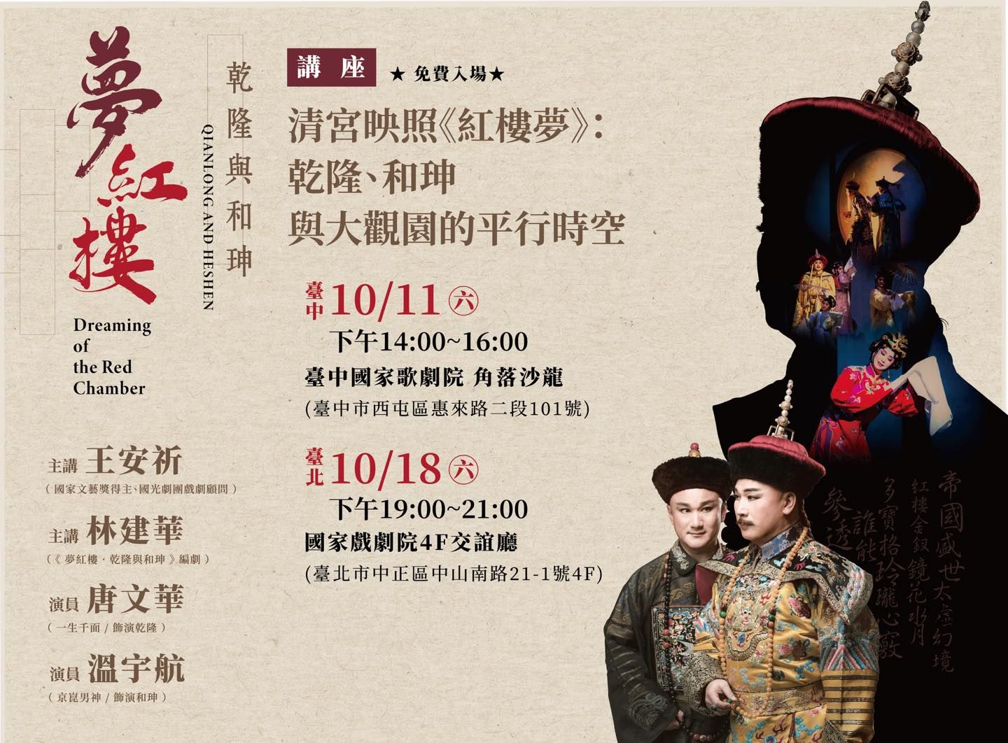 10月12日星期日起至10月19日星期日,透過「現場領取」方式,免費索取本次在國家戲劇院演出之《夢紅樓‧乾隆與和珅》節目票券。