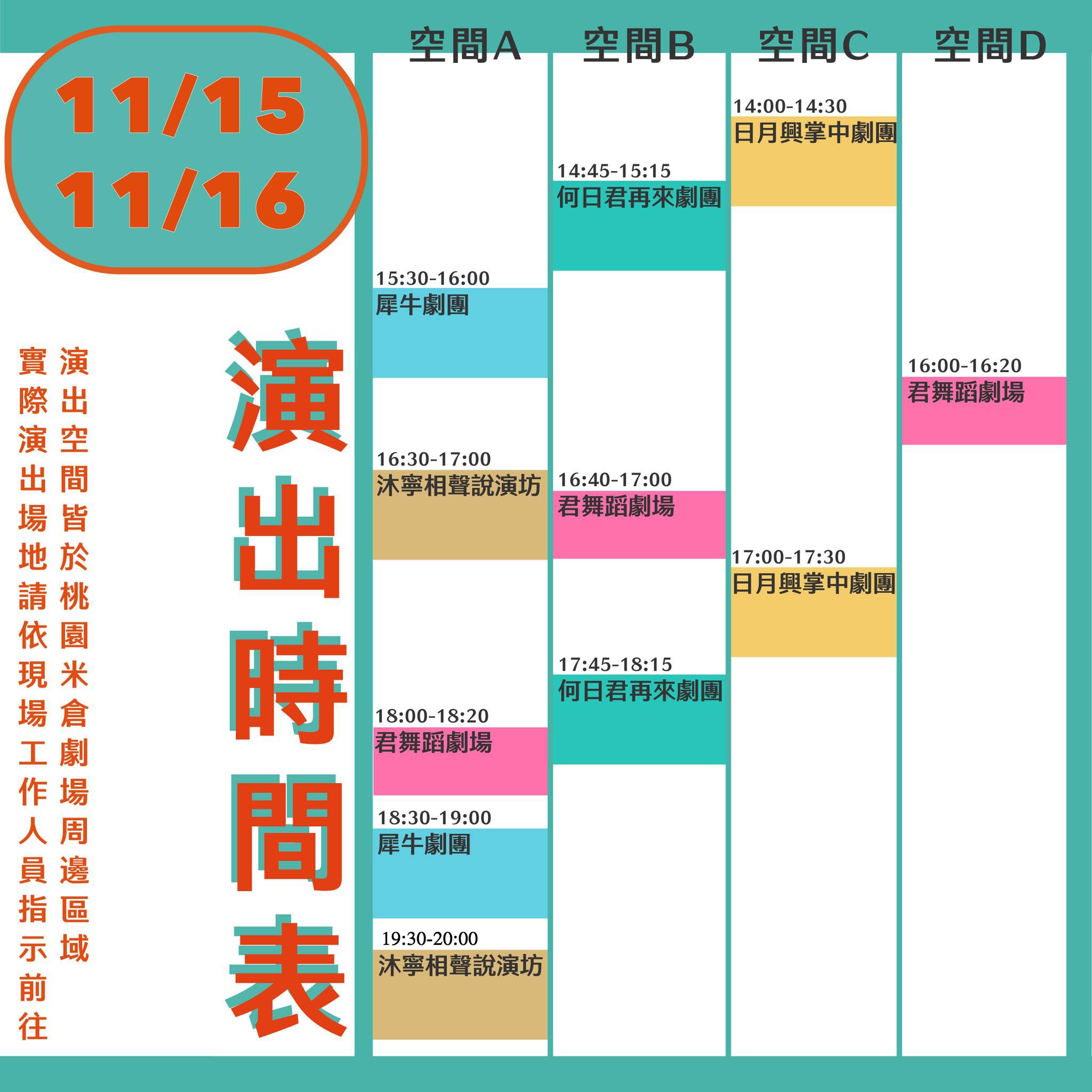 演出團隊│日月興掌中劇團、沐寧相聲說演坊、何日君再來劇團、君舞蹈劇場、犀牛劇團(按團名首字筆畫排序)