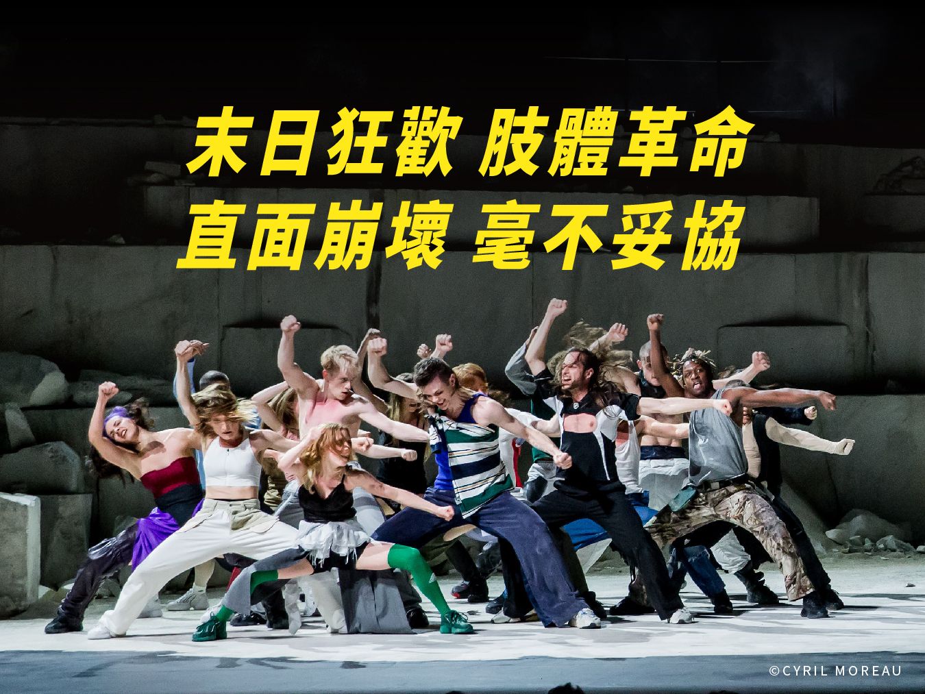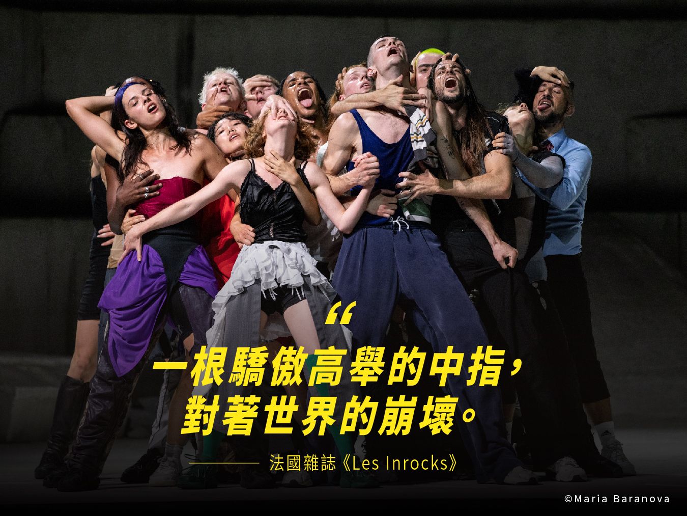 法國前衛編舞團隊狂徒2019年起接任馬賽國立芭蕾舞團藝術總監,首部作品《崩世光景》(Room With A View) 延續其帶有激進政治性的美學實驗,與法國電子音樂製作人霍恩攜手,將舞臺重塑為一座蘊藏憤怒的末日景觀。將狂烈怒吼轉變為不馴的戰歌,以脆弱肉身衝撞巨大的怪物,為年輕世代贖回面對氣候災變、父權瓦解、社群疏離種種崩壞的勇氣。末日裡的餘生,也是重生。