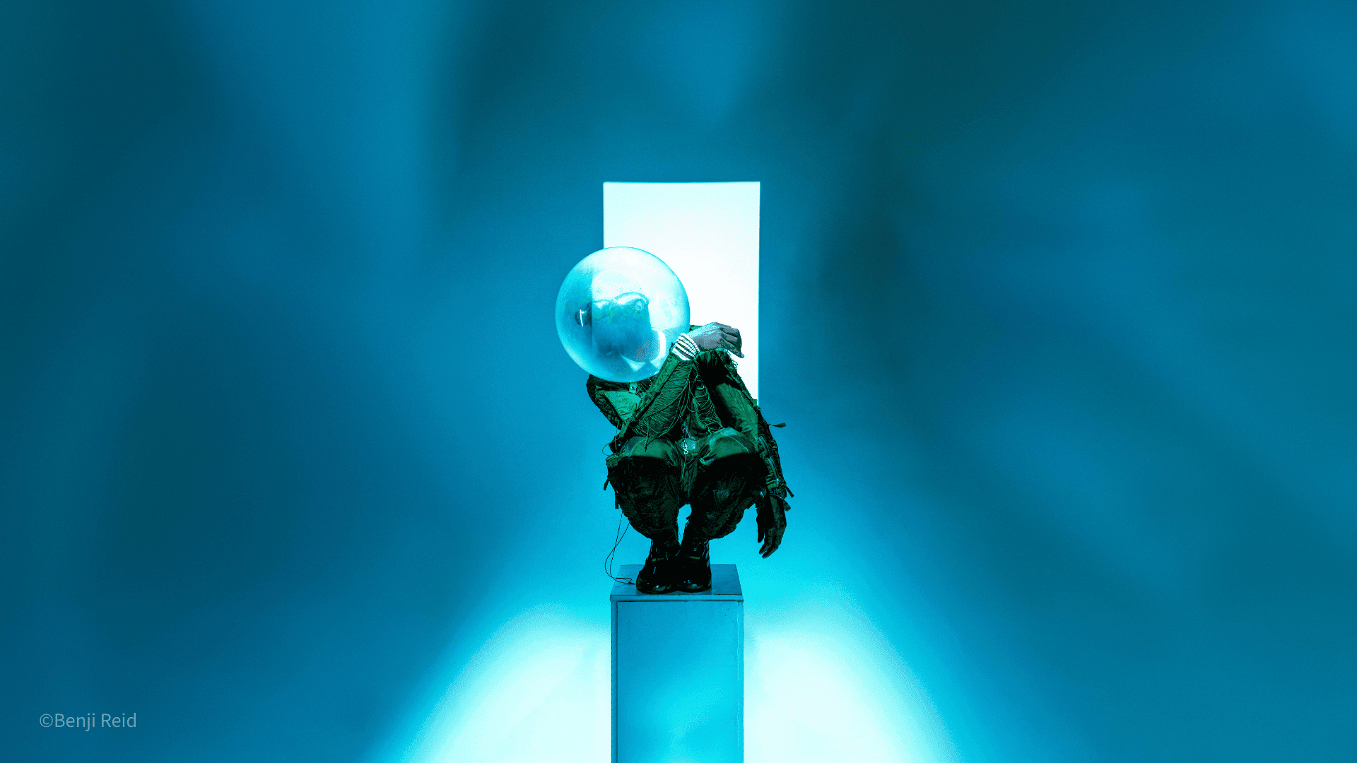 在《即席寫真》中,班吉・瑞德(Benji Reid)將非洲未來主義(Afro-futurism)帶上舞臺,以影像、裝置與表演交織出充滿未來感的場域。他時而乘著雲朵漂浮空中,時而戴上如太空探險般的頭盔,宛如穿梭於異次元與銀河之間。奇幻與科技的結合,激發觀眾對未來的想像與期待。