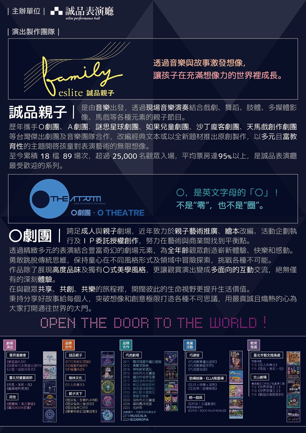 本演出為「誠品表演廳」與「O劇團」攜手合作,推出2025全新原創親子劇場旗艦製作,結合經典童話故事的舞台盛宴!創作靈感源自《木偶奇遇記》、《小王子》、《賣火柴的小女孩》、《愛麗絲夢遊仙境》與《糖果屋》五部經典童話文學,故事角色們將跨越書頁,在這故事錯亂顛倒的冒險旅途中,一同找回信任、誠實與愛的價值。帶領大小觀眾一起踏入這神秘的「讀冊」店,感受閱讀的魔幻魅力!