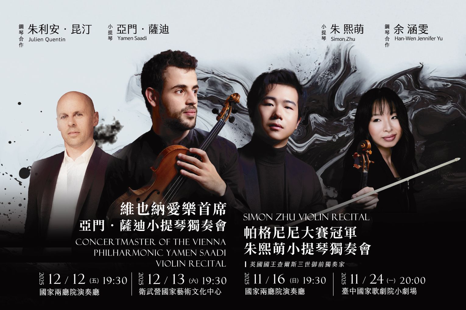 開場曲為德國浪漫樂派作曲家舒曼於 1851 年杜塞道夫時期創作的〈第一號 A 小調小提琴奏鳴曲〉。這是他在精神狀況日漸不穩定、卻仍保持旺盛創作能量的晚期作品。音樂中瀰漫著壓抑與激情並存的矛盾氣息:首樂章急促而動盪,彷彿情緒被長久壓抑後的爆發;第二樂章行板展現出克拉拉式的溫柔與歌唱性;終樂章則以近乎狂熱的能量收束,全曲如同理智與幻覺之間的對話,在臨界邊緣燃燒。 中段曲目轉向義大利炫技派代表帕格尼尼的作品,包含〈鐘〉、〈24 首隨想曲〉中的第 1、5、24 首,以及〈心慌意亂主題與變奏〉。這些作品以極致的跳弓、左手撥弦與高音泛音,展現小提琴的戲劇張力與義大利式的歌唱特質。 壓軸曲為比利時作曲家易沙意改編自聖桑的〈圓舞曲形式的隨想曲〉,以華麗的圓舞節奏與雙音技巧,呈現法國式的優雅與比利時樂派的自由氣息,在小提琴與鋼琴間交織出華麗而清新的終章,為整場音樂會畫下燦爛句點。