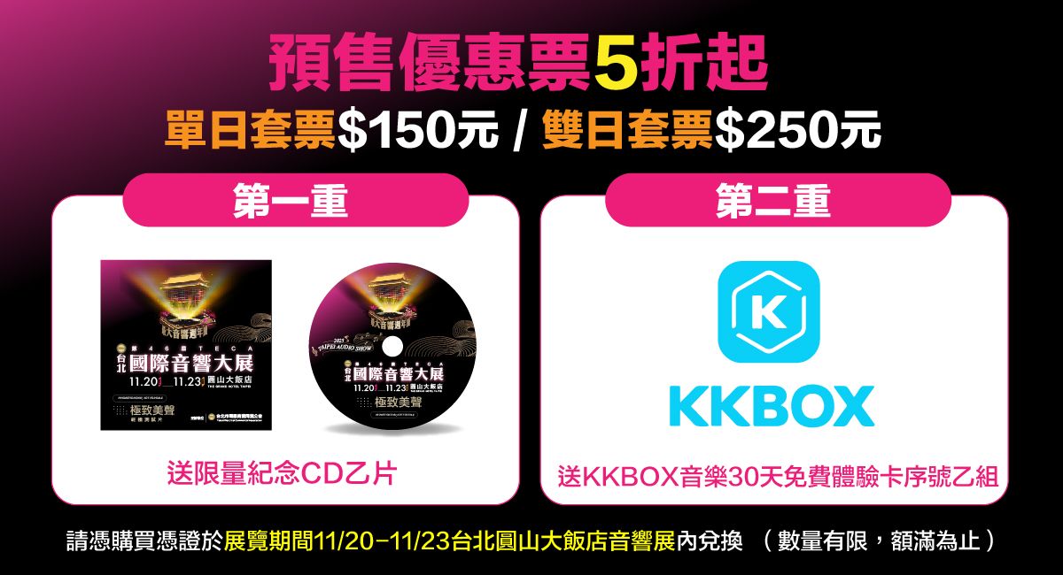 早鳥預售票享5~6折優惠,再贈送限量紀念CD乙份+KKBOX無損音質30天音樂體驗卡序號乙組,限量珍藏送完為止。
