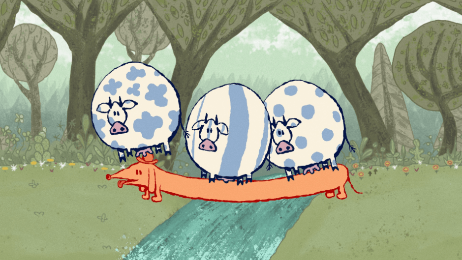 一隻臘腸狗變成了一座橋,讓各種動物從牠身上走過。一隻貓看到了商機。
