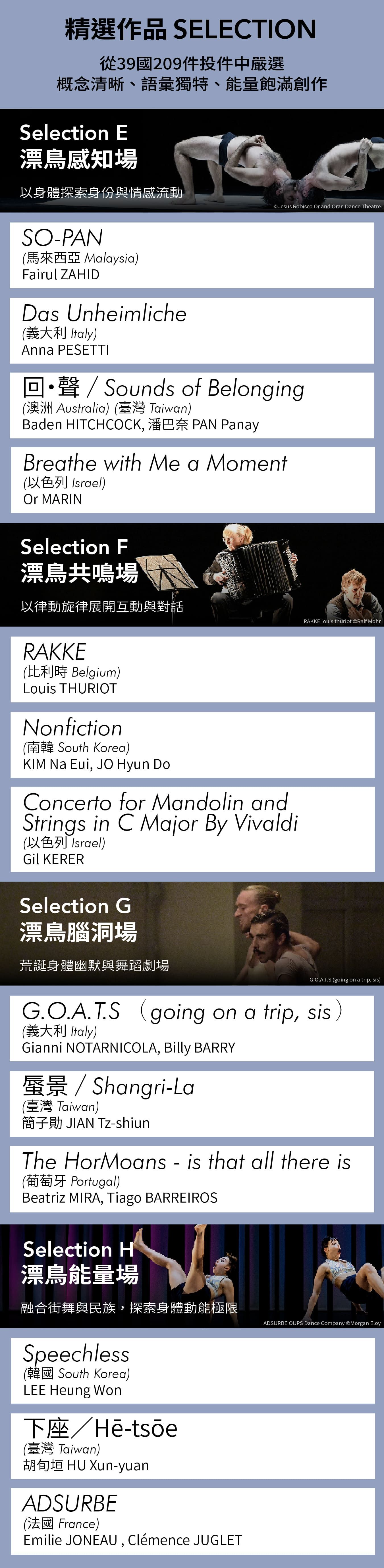 ◎Selection: Choreographers submit solo or duet works through an annual open call. Selected artists are invited to Taiwan in the winter to perform innovative pieces with clear concepts and refined techniques.