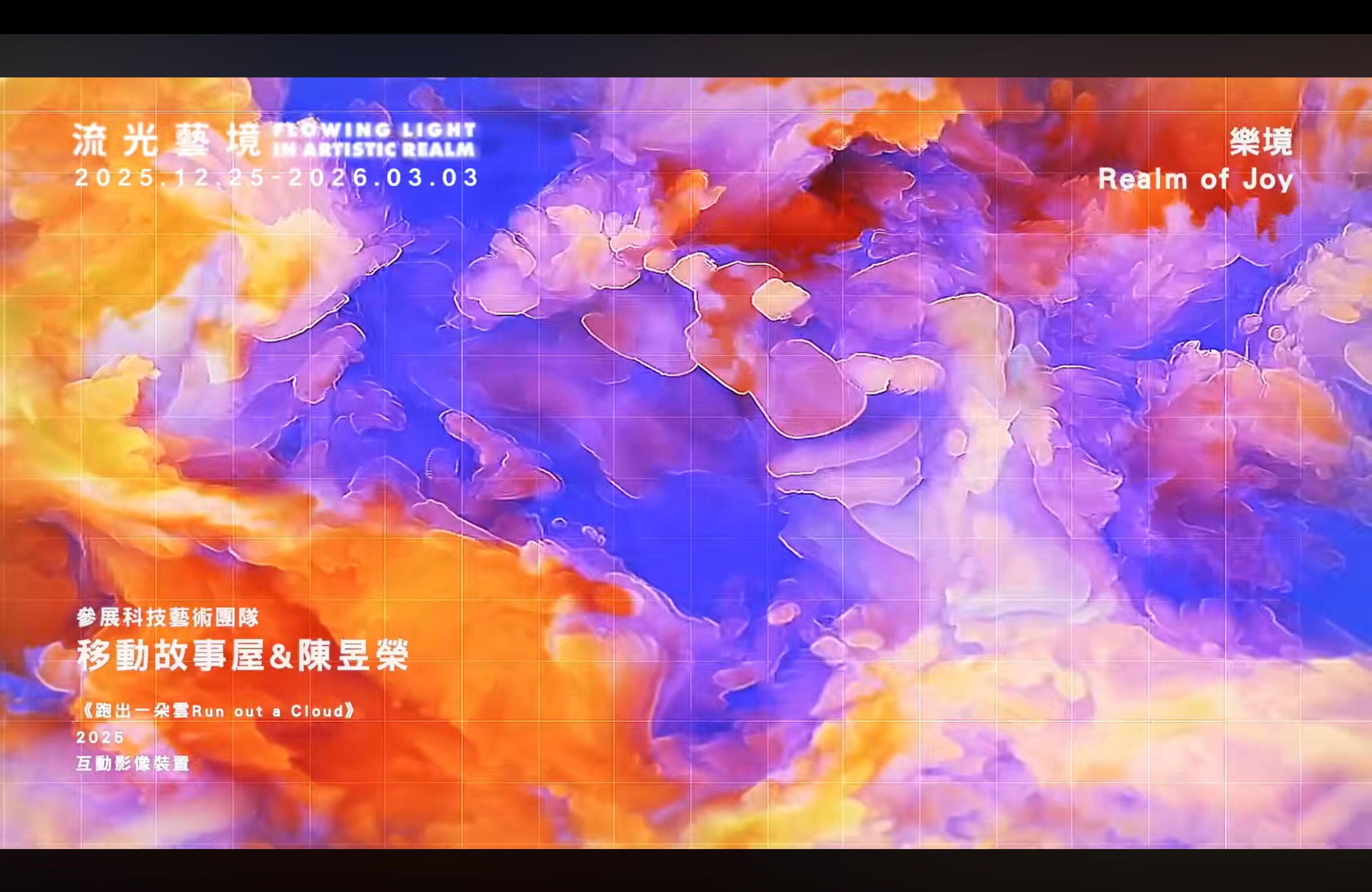 《流光藝境》特展以旅居加拿大的華裔女性藝術家 ZHEN-RU 的影像創作為核心,打造一場多感官沉浸式的藝術體驗。展覽包含六個單元:看見色、聆聽聲、嗅聞香、交流語、體驗觸、沉浸意,邀請觀眾進入色彩與心靈交織的藝境。ZHEN-RU 透過獨特視角與鮮明色彩,捕捉現實景物的流光片刻,映現出她對萬物的深刻感知。作品不僅是視覺的饗宴,更是一場靜心與療癒的旅程。展覽邀集台灣多組科技藝術團隊,共同以投影、聲音、香氛、互動裝置與藝術投射等技術,將影像擴展為全身心的感知體驗。這場展覽不只是觀看,而是邀請觀眾超越現實空間,探索內在無限的曼妙風光,讓藝術成為與心靈深度對話的契機。