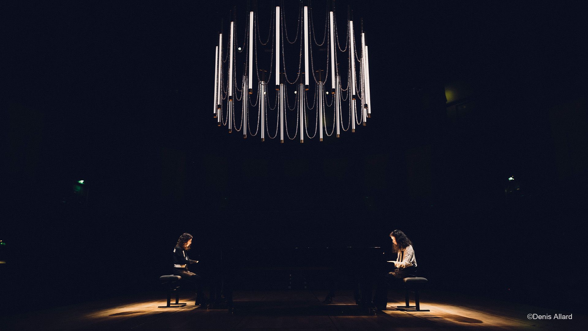 To heighten the audience's listening experience of each opera, stage director Cyril Teste and stage designer Nina Chalot have placed a chandelier above the pianists to produce an atmosphere of intimacy. The object offers endless different possibilities in terms of staging (set, lighting, video, text and more) and dramatics to enlighten listeners during the successive performances of the three suites.