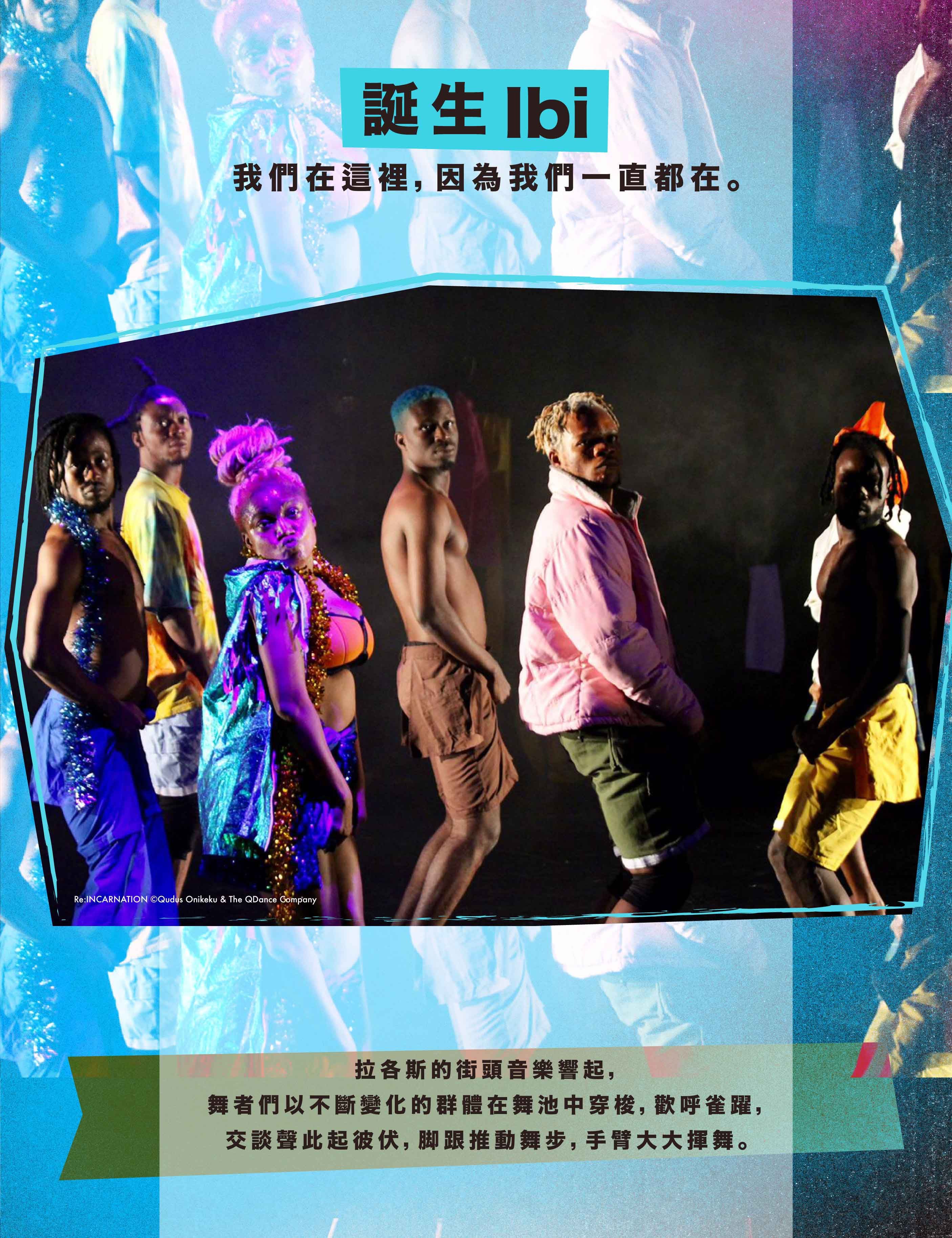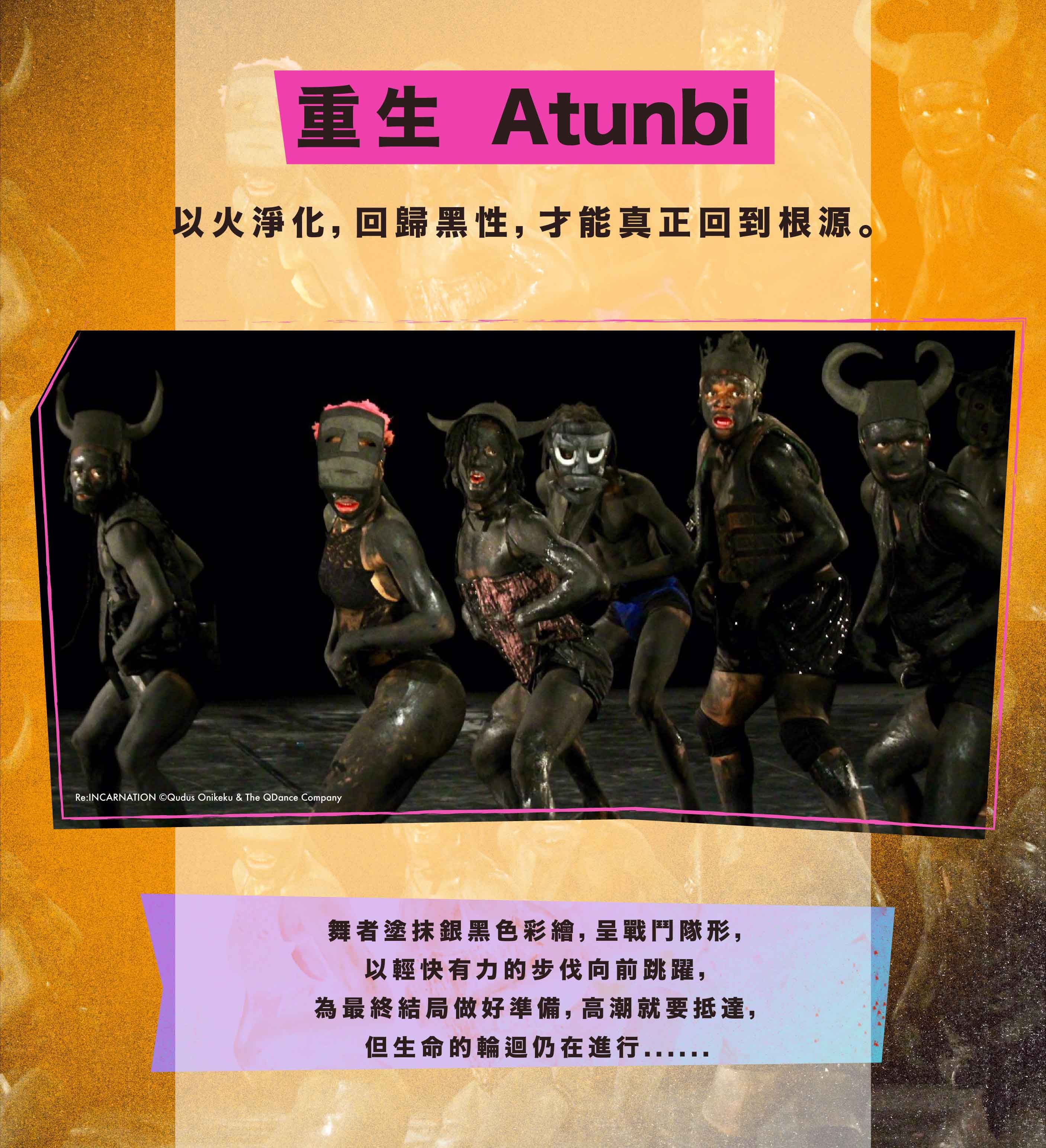《轉轉生》 (Re:INCARNATION) 融合舞蹈、音樂、時尚與視覺藝術,展現古老約魯巴文化智慧,纏揉當代奈及利亞年輕世代色彩,挾帶強大氣勢,吐納家族、街頭和社會養分,反轉壓迫體制,看破掙扎與革新不過一線之隔,重新定義身體與傳統,激情動能不再收斂,提取勇氣和自信,創造出鋒芒畢現的90分鐘。