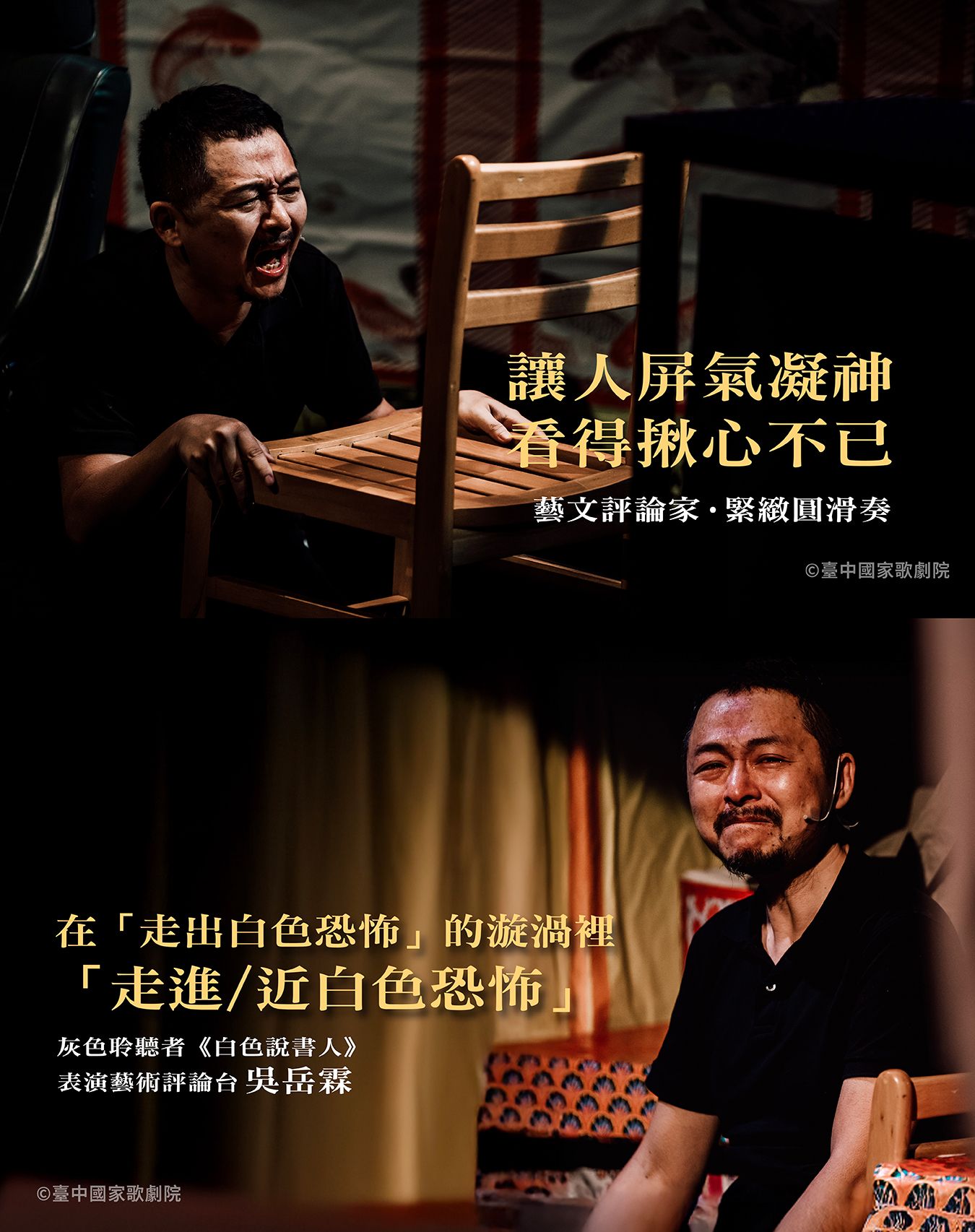 Directed by Tai Chun-Fang and written by Chan Chieh, two award-winning theatre artists renowned for their talent and experience in blending diverse art forms to create a unique yet universal theatrical language, White Storyteller premiered at National Theater and Concert Hall Experimental Theater in 2017. It achieved both box-office and critical success, followed by domestic tours and international performances at the SPIELART Festival Munich. The production was also shortlisted for the 2018 Taishin Arts Award.