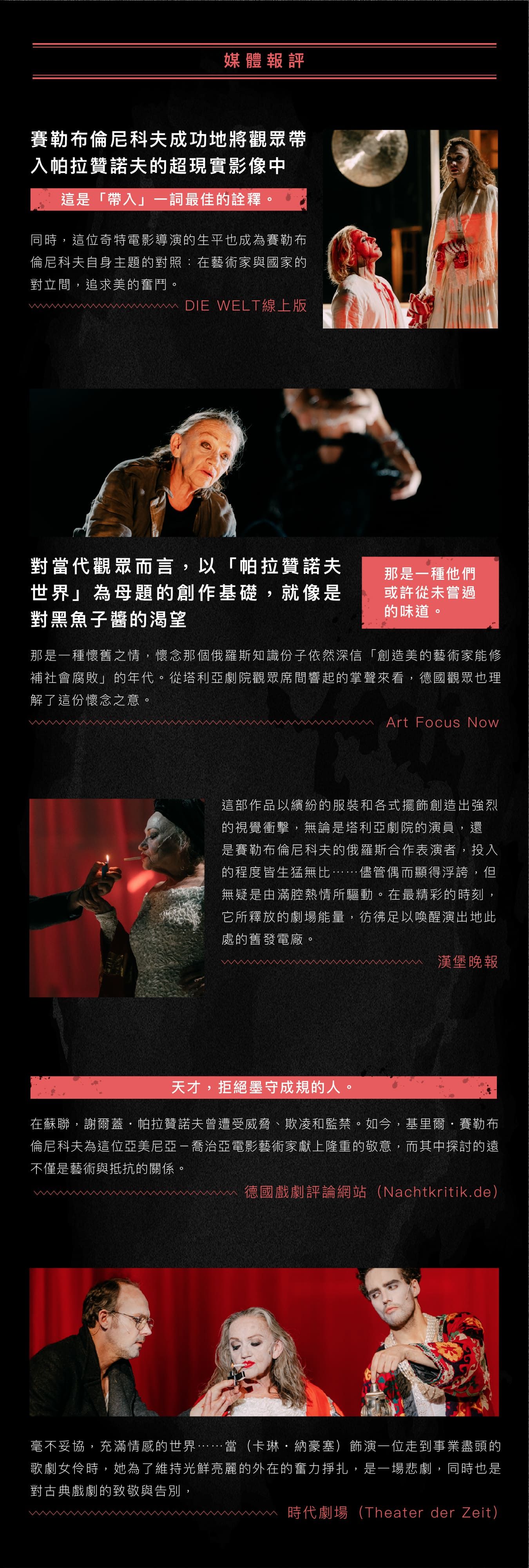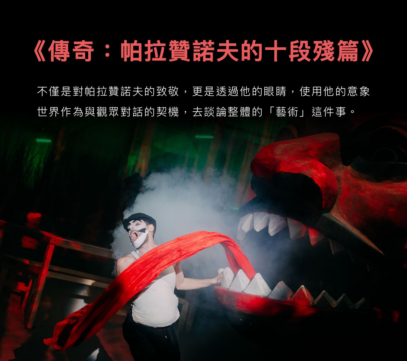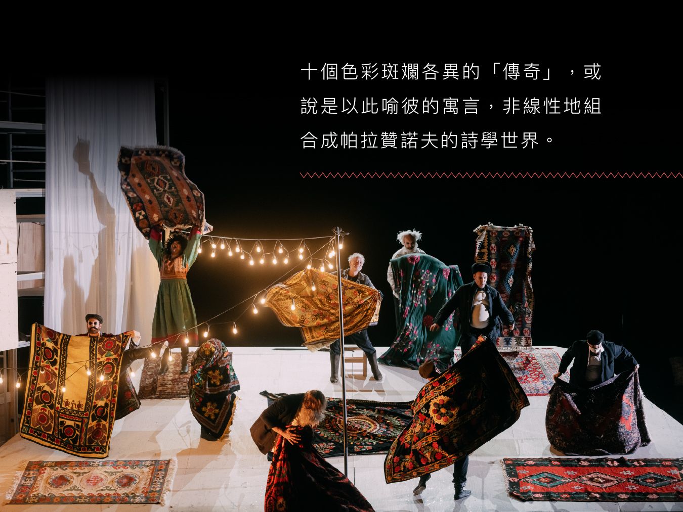 最黯淡的面容、最懇切的歌唱、時而斷裂、時而靜止的肢體、悲憫的神情、肅穆的器樂、鮮艷的裝置、光怪陸離的拼貼,一些只有在夢中或是宗教畫中才得以繚繞不去的元素,建構起萬花筒般每個時刻都並不相同,卻又讓人覺得似曾相識的《傳奇:帕拉贊諾夫的十段殘篇》。