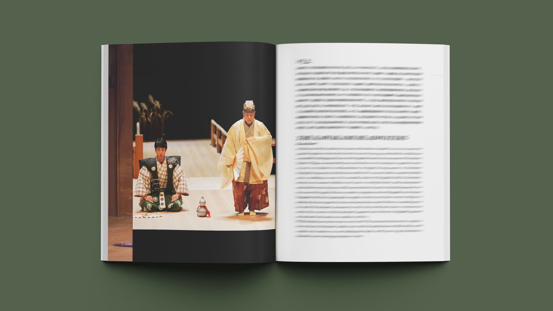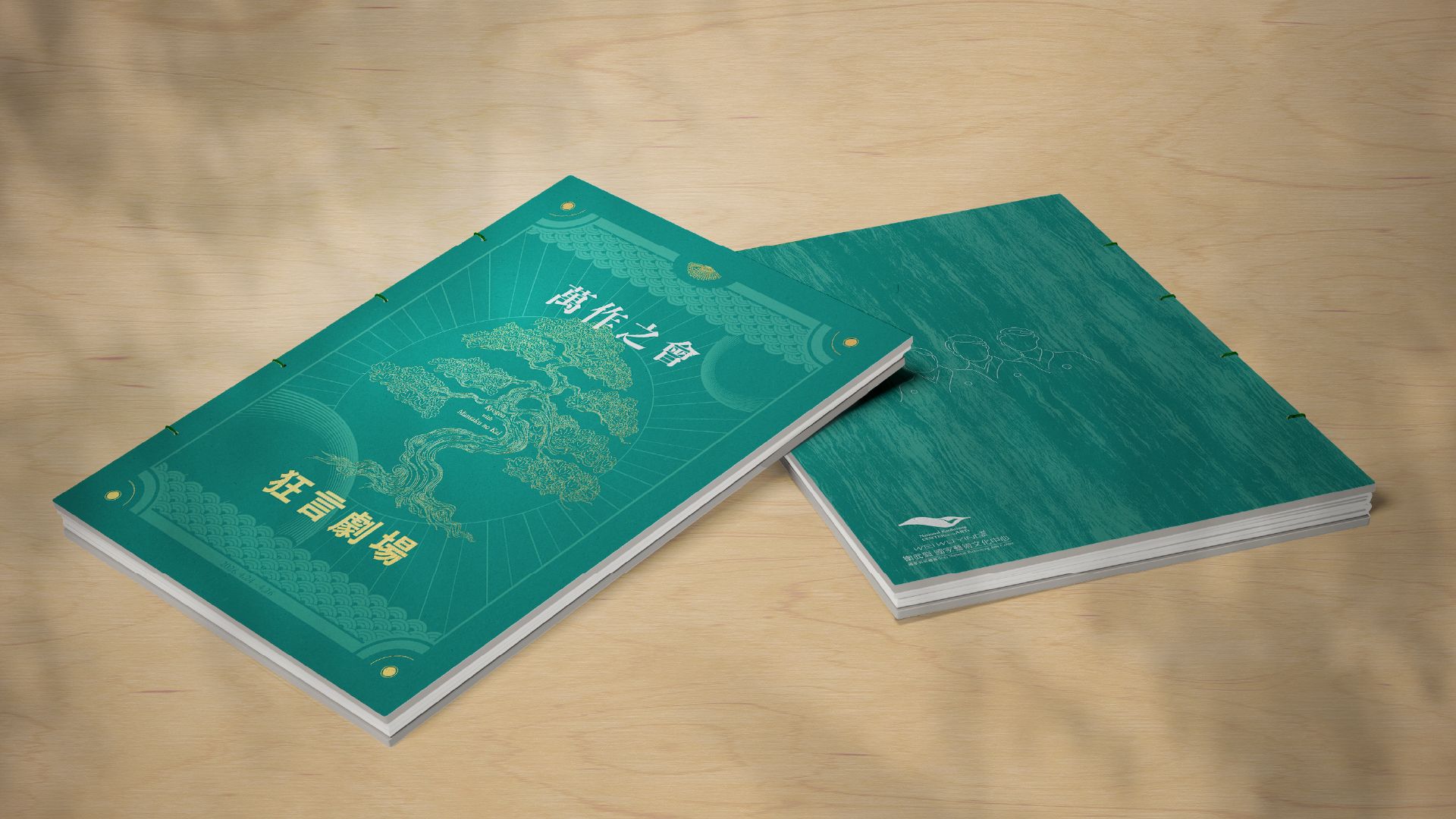本次節目冊設計致力於傳遞日本傳統藝能美學。外觀以帶有細膩光澤的金屬色油墨結合沐光紙為基底,襯托狂言舞台上永恆不凋的靈魂標誌——「蒼松」。透過精湛的燙金工藝,將松樹的蒼勁與古典藝術的經典意象完美交織,營造出尊貴且內斂的視覺層次。