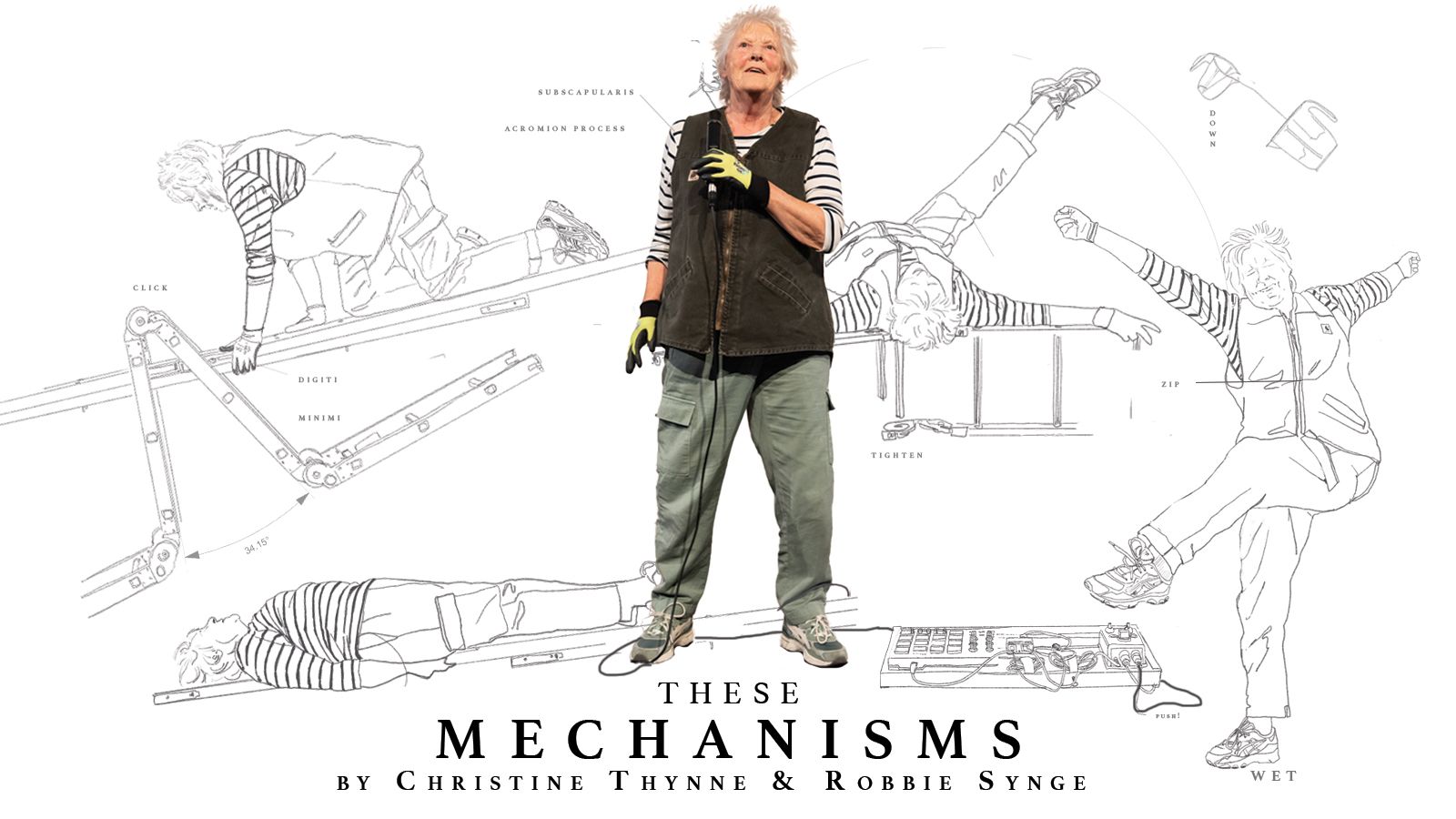 Christine 是一位新興舞蹈創作者,同時也是一名海上獨木舟(Sea Kayak)愛好者。她最初於 1960 年代接受物理治療師訓練,並教授「音樂與動作」、解剖學與按摩。作為 Dance Base 的 PRIME 團體成員,她曾與多位蘇格蘭藝術家合作並演出。2021 年,80 歲的 Christine 獲得 Luminate 獎助金,開始探索屬於自己的編舞實踐,並展開個人創作的研究。《These Mechanisms》是 Christine 與 Robbie 之間長達十餘年的持續合作之一,也包括作品《Ensemble》(2018;2019 年入選 Aerowaves;2019 年作為「Made in Scotland」計畫的一部分入圍 Total Theatre Awards)。