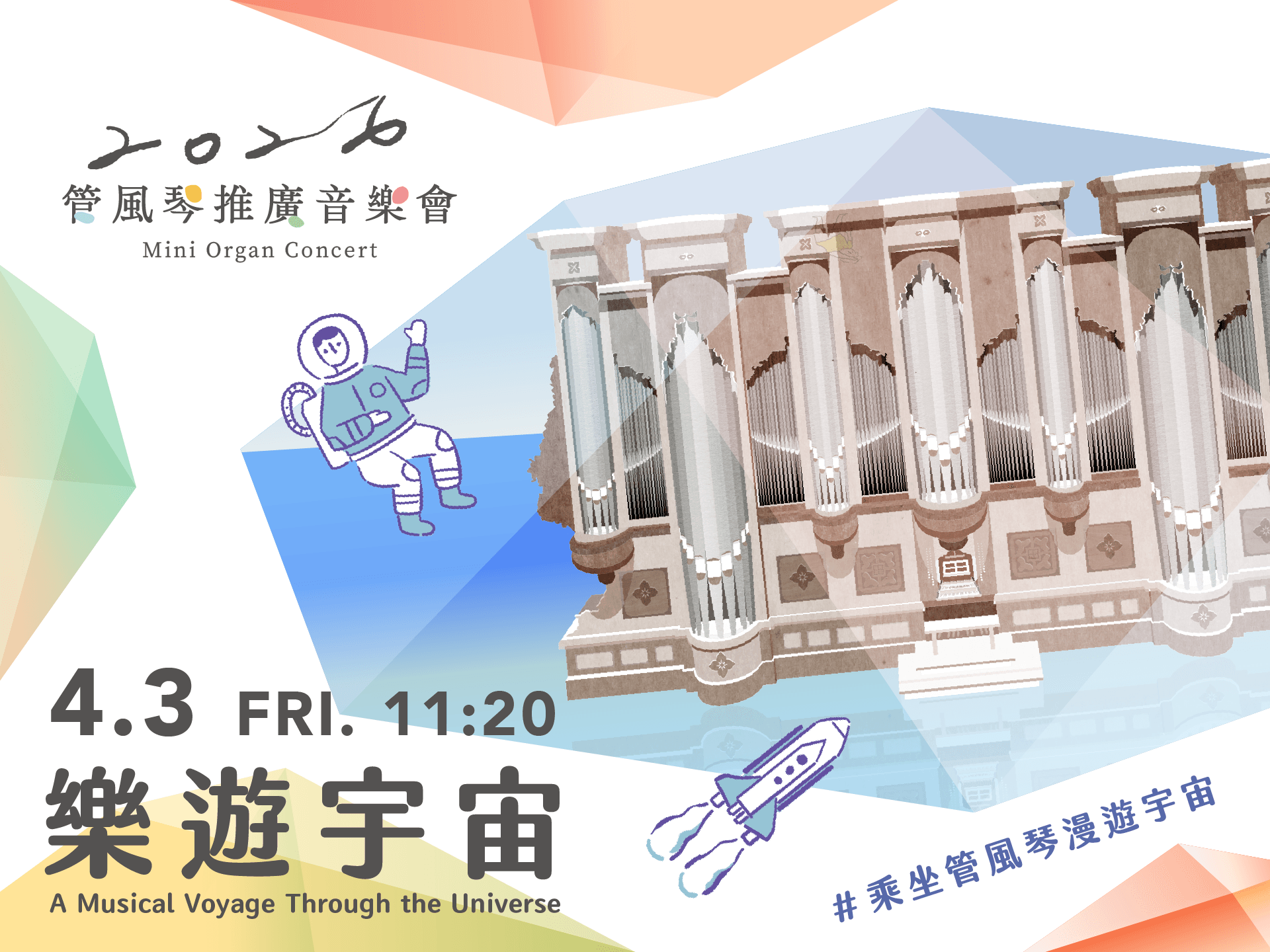 2026 兒童節最強檔!送給孩子一場浩瀚的聲音探險!本次演出由「星空領航員」——管風琴家徐佳郁策劃,攜手鋼琴家林亮宇與擊樂家洪郁媜,透過管風琴的雄偉氣魄、鋼琴的靈巧細膩,以及打擊樂的動感脈搏,為大小朋友編織出一幅壯麗的宇宙圖景。
