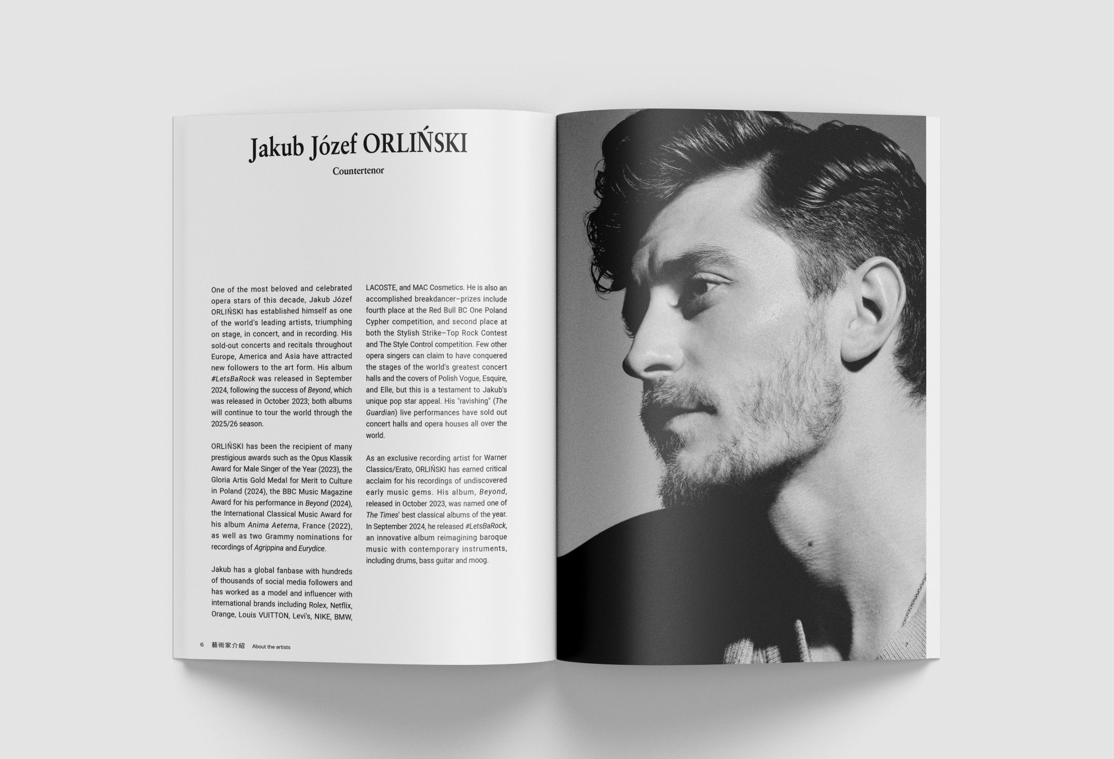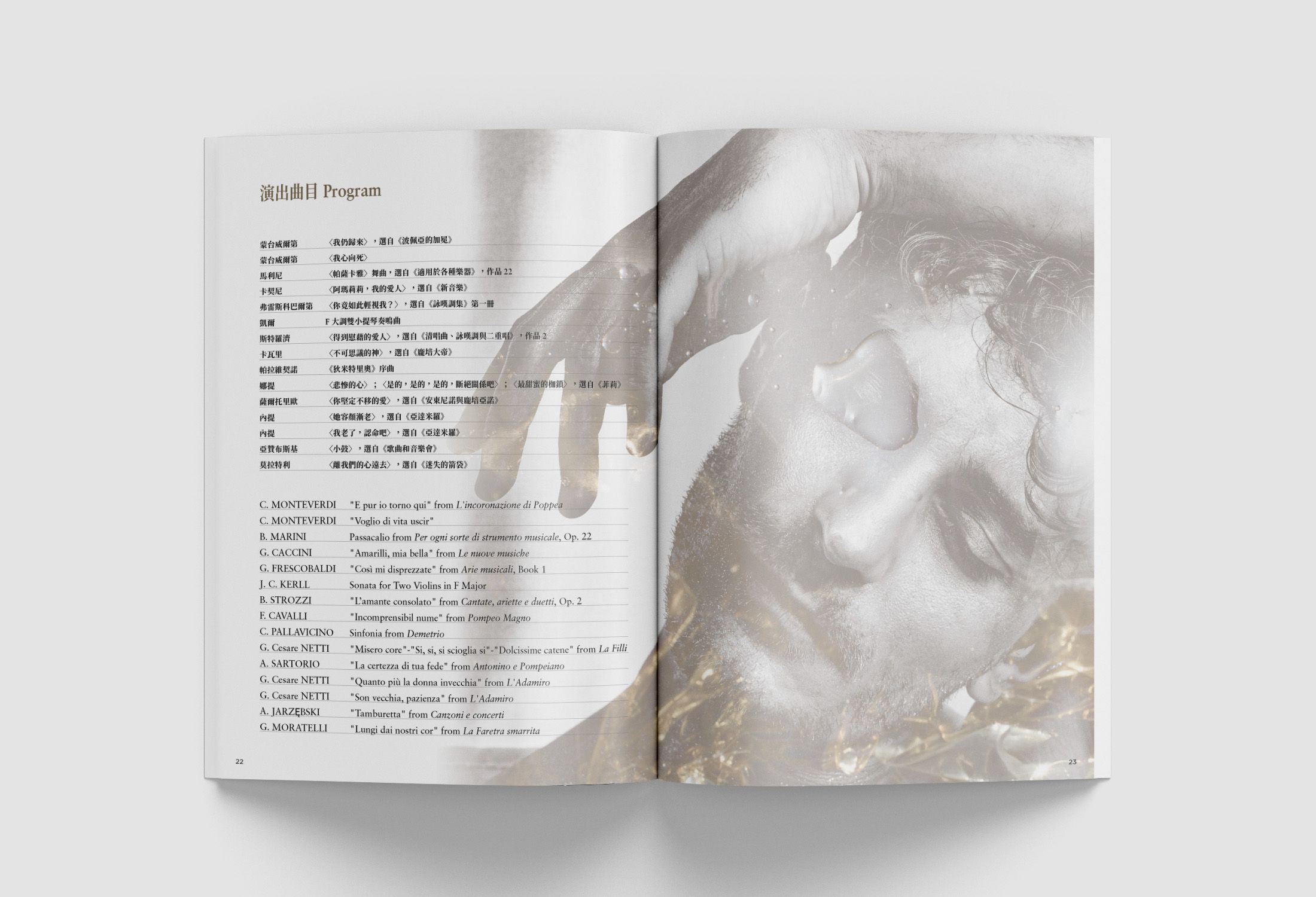 為了完整記錄這場難得的視聽盛宴,節目冊封面特別以黑白肖像結合流動金線的視覺設計,呼應奧林斯基兼具古典底蘊與現代張力的獨特氣質。內容除完整介紹金蘋果古樂團與奧林斯基的演出陣容外,更貼心收錄演出曲目的原文與翻譯歌詞對照,讓您細細品味巴洛克詠嘆調的情感意境,為這場「超越」之旅留存美好的記憶。