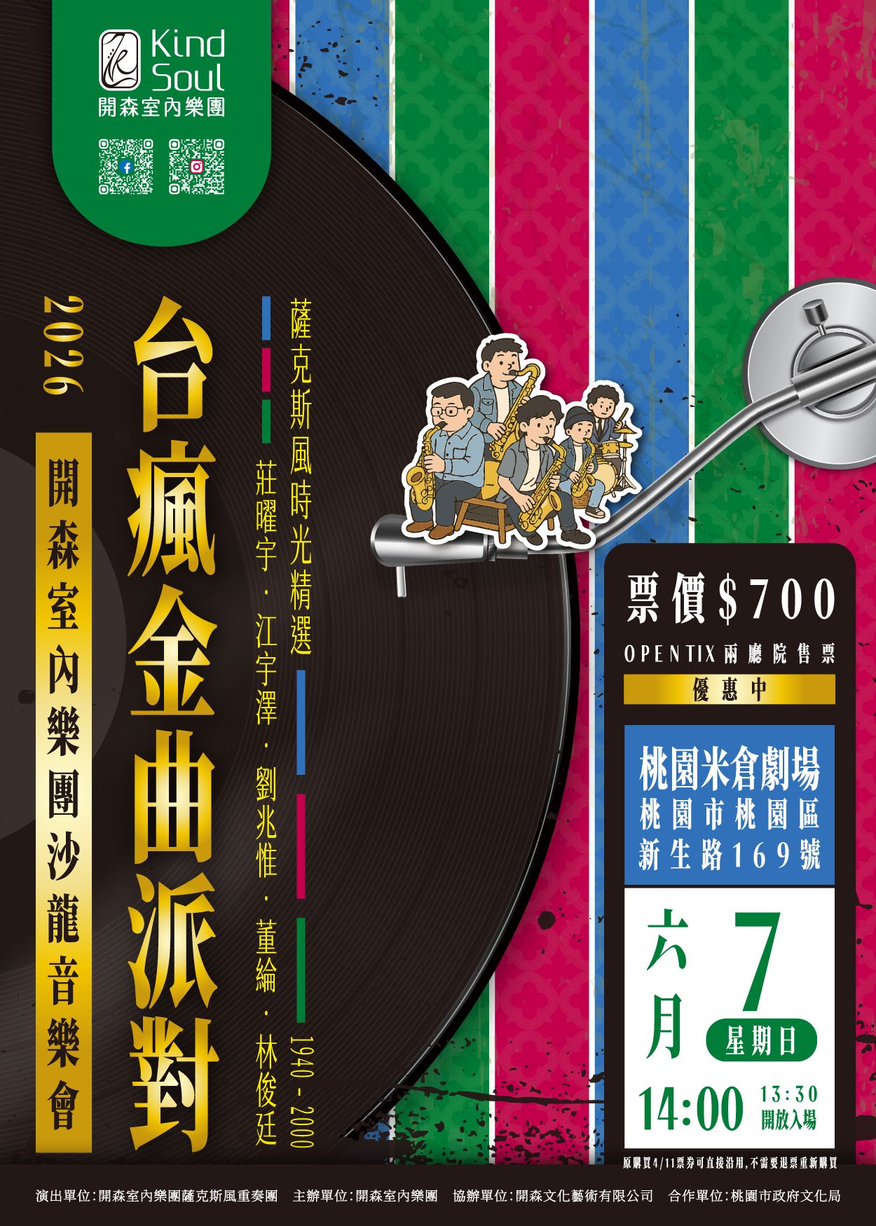 跟著薩克斯風🎷吹響時光的號角📯,一次聽遍1940-2000經典國語、台語、校園民歌,全場跟著唱到燒聲!從《給我一個吻》💋到《失戀陣線聯盟》💔,從《山頂的黑狗兄》🐕‍🦺到《鼓聲若響》🪘,每一首都是我們青春中最動人的篇章。那些陪你走過愛情、思念與夢想的歌,一次唱好唱滿!開森室內樂團薩克斯風重奏團,邀請您用音樂喚醒記憶,唱出屬於我們的黃金年代。帶爸媽重回青春、揪朋友一起大合唱,今年最歡樂的音樂派對,不來絕對會後悔!