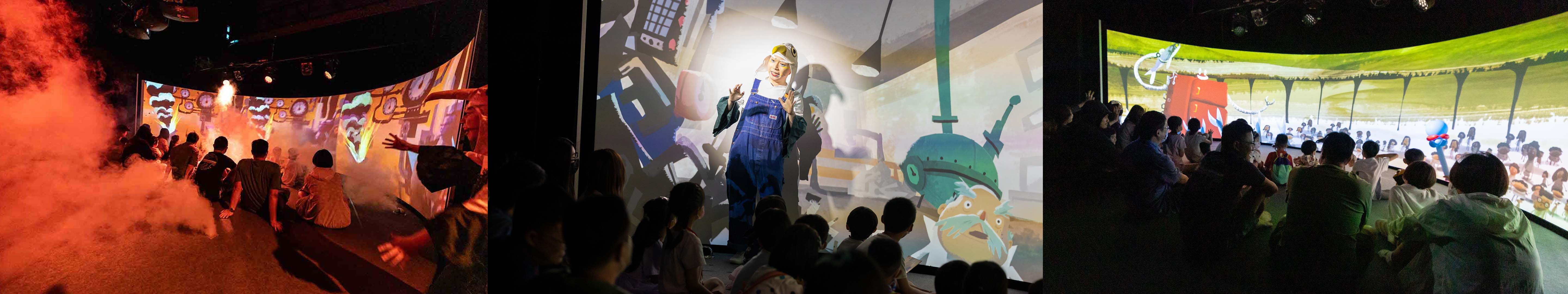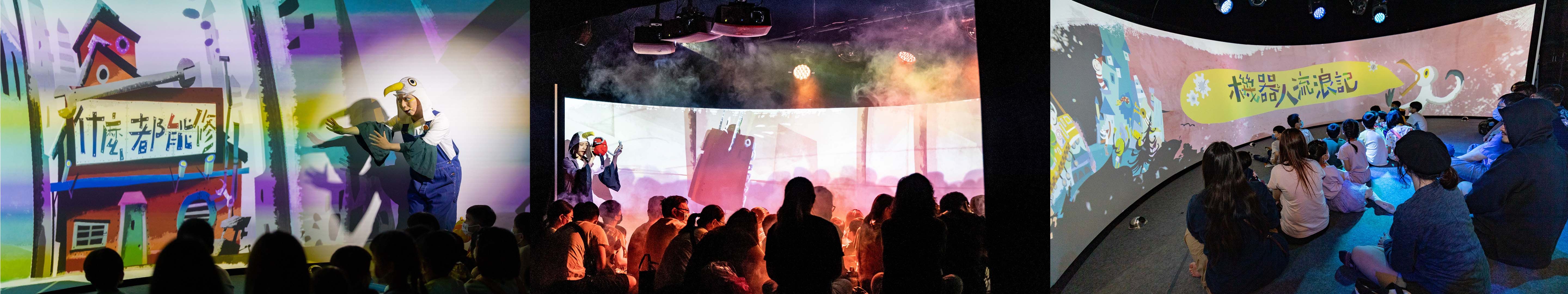 Telling Tent is a family-friendly theater created with the concept of crossing boundaries and aimed at developing novel interactive art experiences for children. It gathers young Taiwanese creators from animation, theater, illustration, scriptwriting, space, and design to collaborate on original animations and scripted performances based on local themes. With a focus on an immersive hemispherical screen surrounding the audience, a storyteller guides viewers through a tale with music, light, smoke, vibration, and digital media devices in scenarios. We hope to inspire children's interest in exploring and seeing the world from different perspectives with this immersive, imaginative, innovative, and interactive experience.