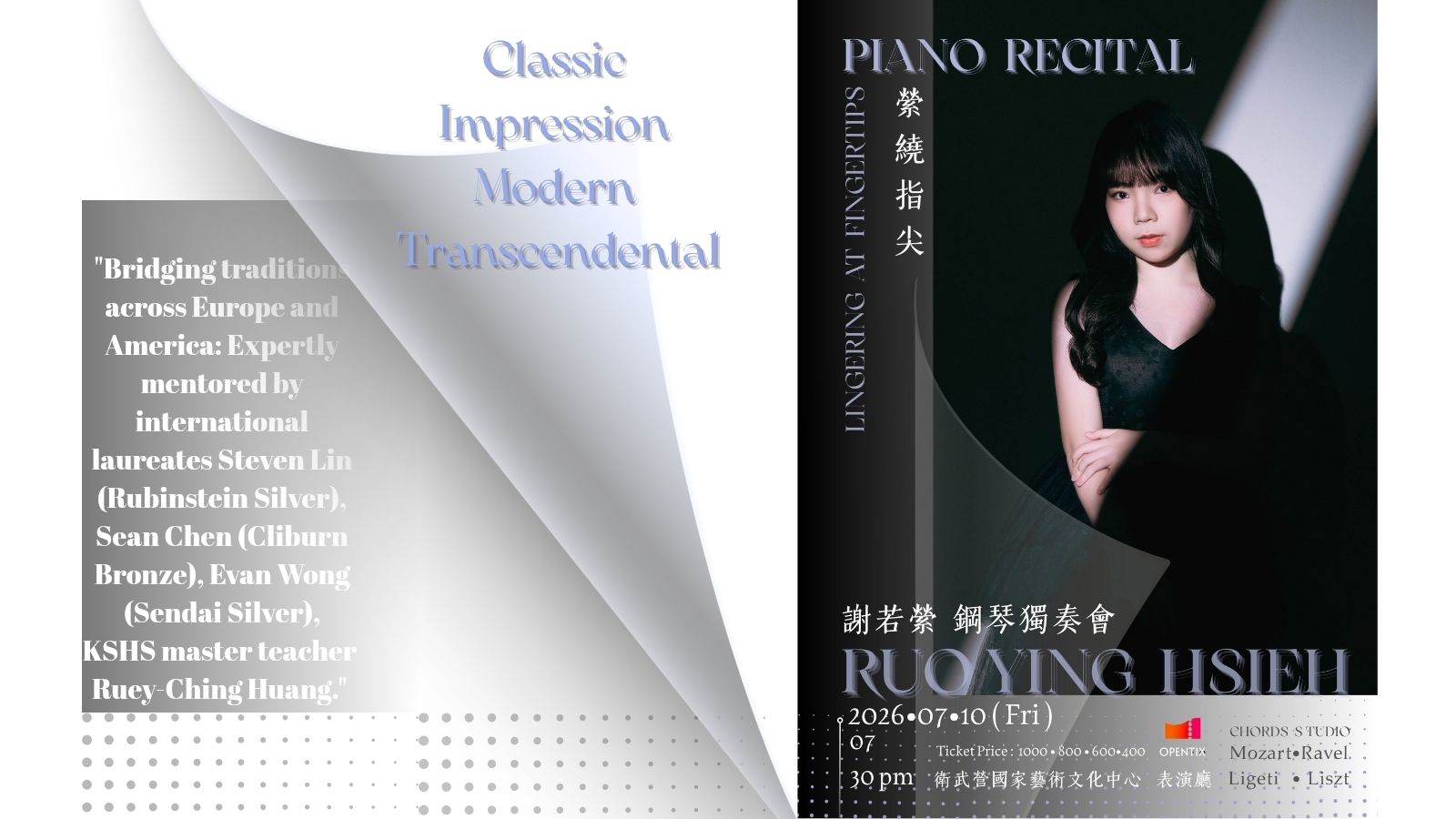 挑戰李蓋悌《魯契卡達》中多元且具備高度創意的音色對話,最終收束於李斯特《敘事曲》與《超技練習曲》中波瀾壯闊的浪漫篇章。