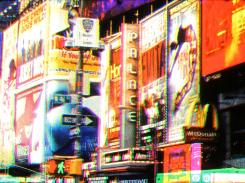 鏡頭轉向時代廣場,此作記錄這個世界著名地標的聲景與絡繹不絕的人潮,並且採用色彩分離法,在拍攝黑白膠卷時加上紅、綠、藍三種濾色片,再於光學印片的過程中套回同一組濾色片,以此在彩色膠卷上還原顏色。手持攝影機捕捉的疊影影像使畫面異常騷動,場景中的數位廣告看版也競相爭取人們的注意。