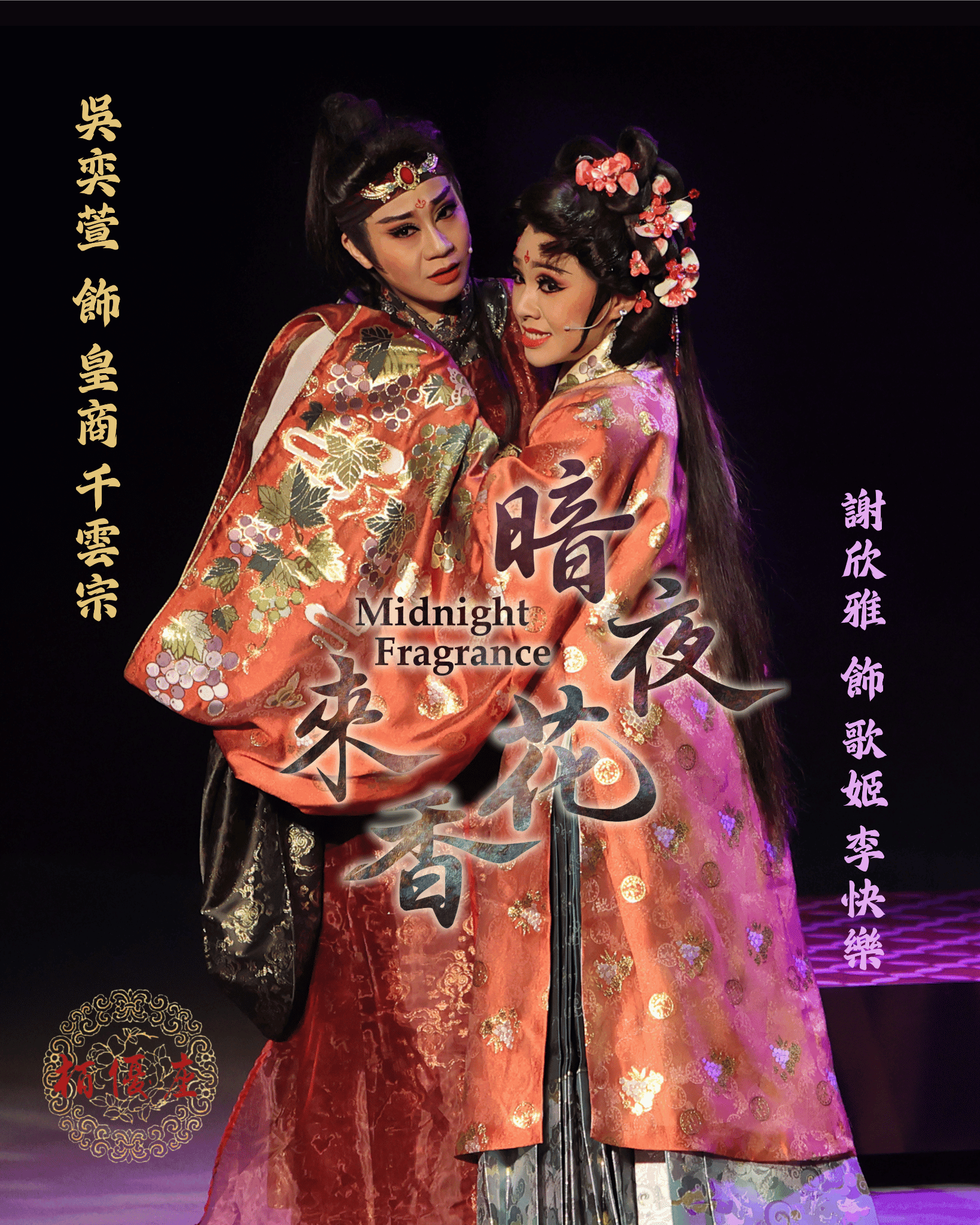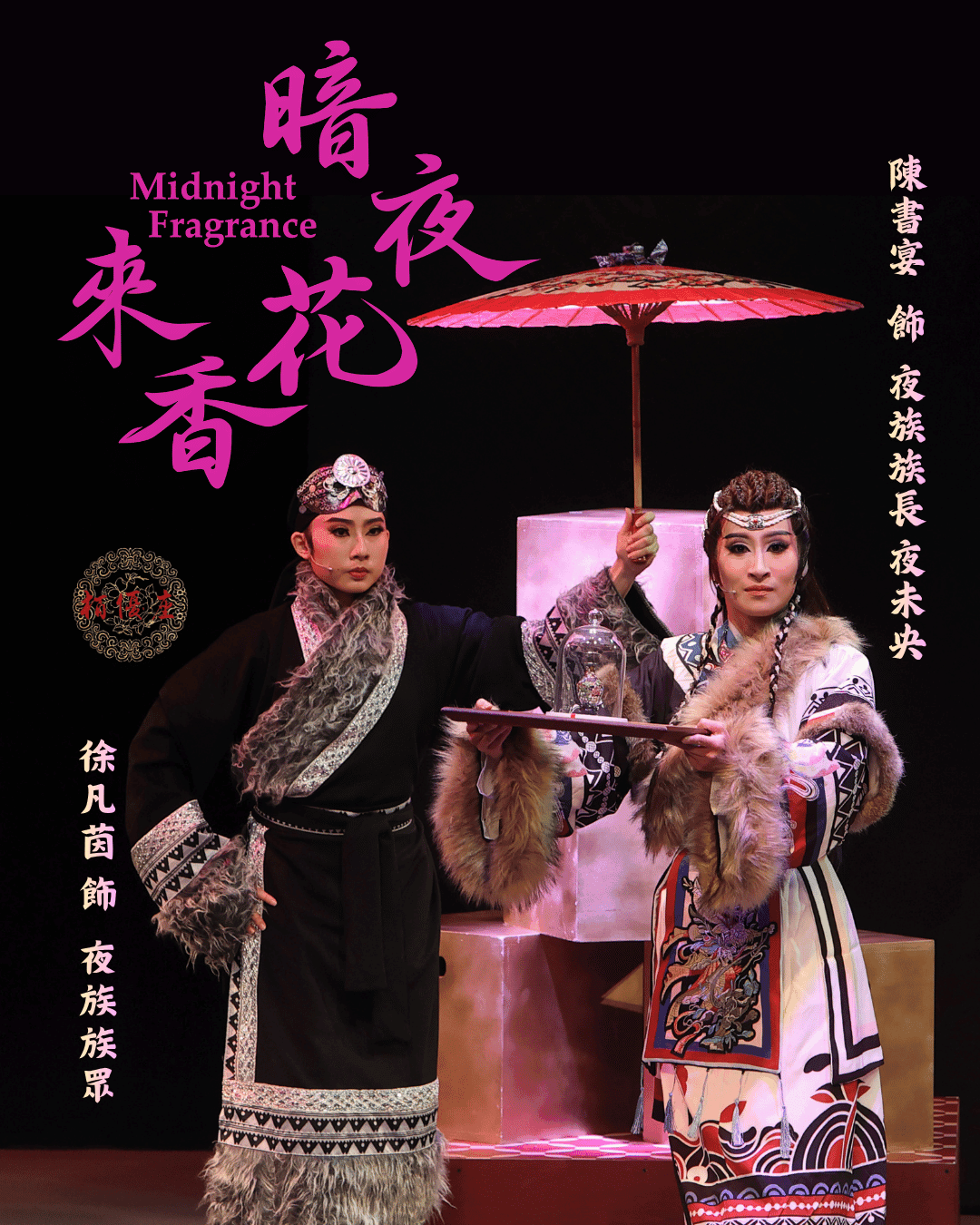 《暗夜花香來》2025年在大稻埕戲苑首演,開賣即轟動。2026除了黃金陣容原班人馬,明華園天字戲劇團-吳奕萱、以及大稻埕青年團出身,歌仔尚青冠軍林祉淩、金穗影帝-楊傑宇與多位優秀演員來參演這次的製作,本次加演再開,特別邀請到栢優座的好朋友,明華園戲劇總團-陳昭賢aka風神寶寶本寶,來出演王小鹿一角,精彩可期,不容錯過。