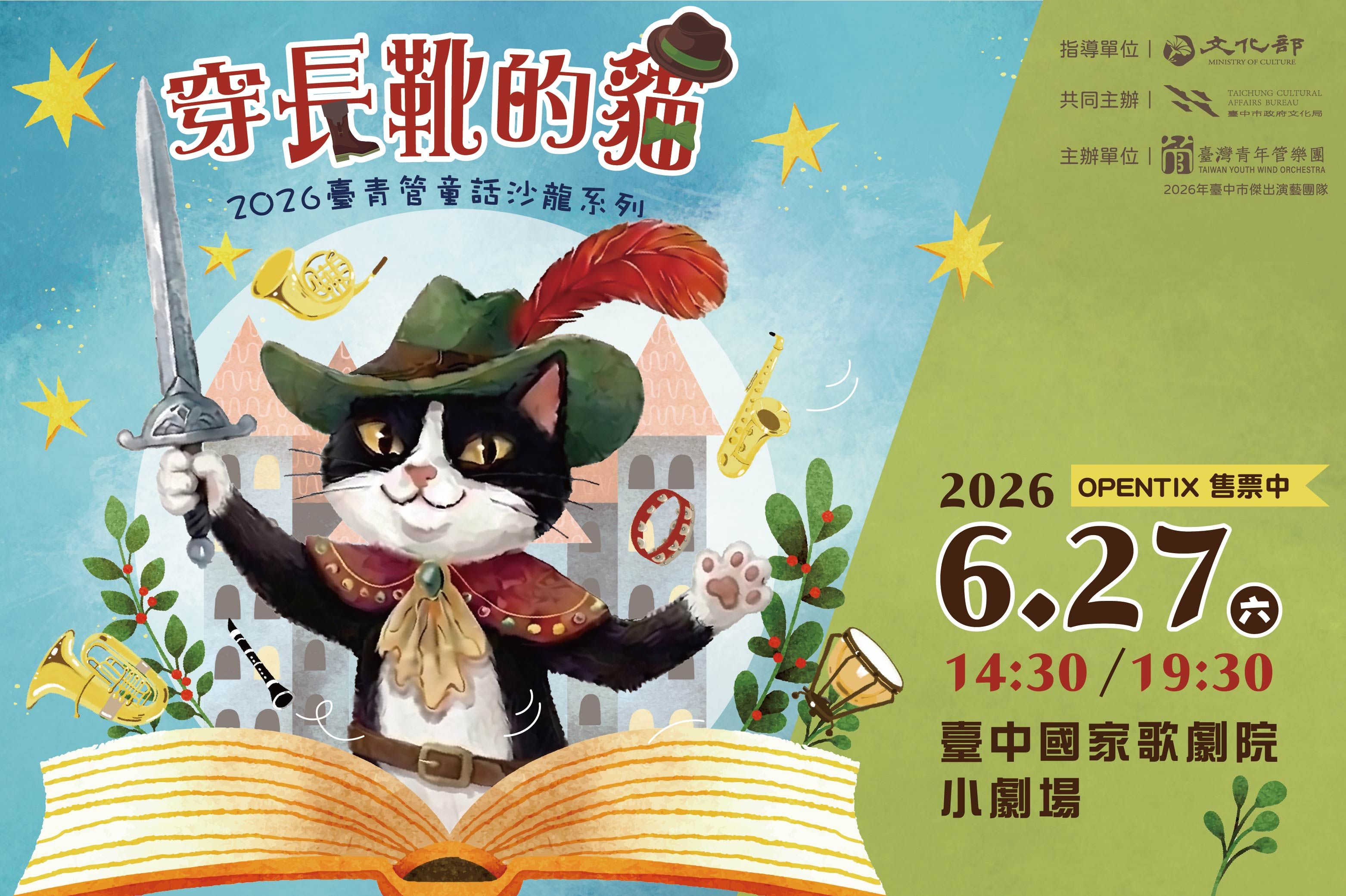 臺灣青年管樂團【童話沙龍系列】經典作品《穿長靴的貓》管樂 × 說書音樂會,2018年首演廣受親子觀眾喜愛,2026年全新升級再製,帶來更精緻的音樂詮釋、更生動的說書節奏與更豐富的舞台互動體驗!以經典童話《穿長靴的貓》為核心,透過管樂團多彩細膩的音色,結合說書人小花姐姐充滿戲劇張力的敘述,讓故事不再只是「聽」,而是透過聲音、情節與想像力交織而成的沉浸式體驗。當旋律化身角色、節奏推動劇情,孩子們將在音樂中看見畫面、在故事中聽見情緒,自然培養對音樂與藝術的感受力。