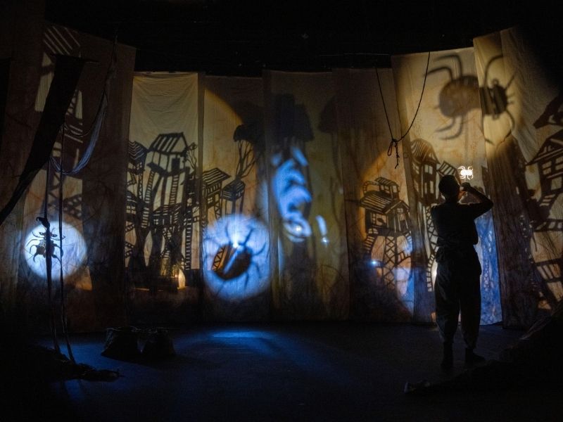 不以對白為主軸的演出跨越了語言限制,讓光影、木偶與自然聲景共同打造出夢幻的舞臺,在操偶師細緻的動作中,甲蟲有了生命力;而光的明暗與聲響互動,也勾勒出雨林獨有的呼吸,帶出一場光影交錯的雨林旅程。