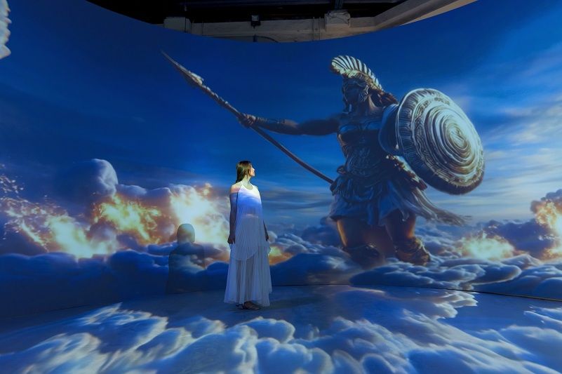 展區以神話意象與建築場景結合展品,呈現從神話走向理性思考的過程。