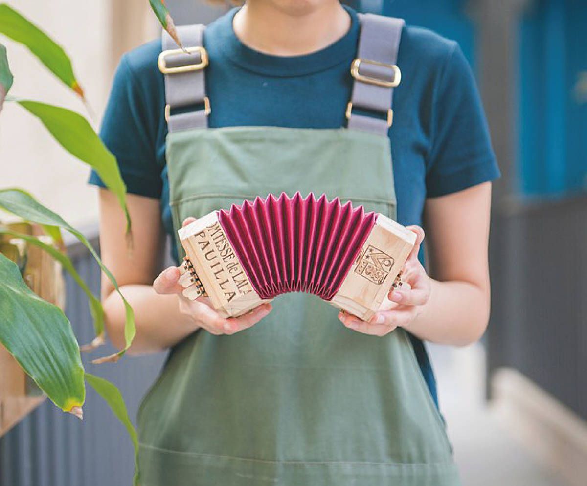 酒箱手風琴 DIY Kit以回收紅酒箱木材製作,每一份組合包都有獨特的木紋圖樣。 大家可以一試親手製作這個簡易版 5鍵10音的手風琴,由摺合風箱開始到打磨木頭,只需數小時便可完成。 配合網上彈奏教學,自己也能學懂演奏!