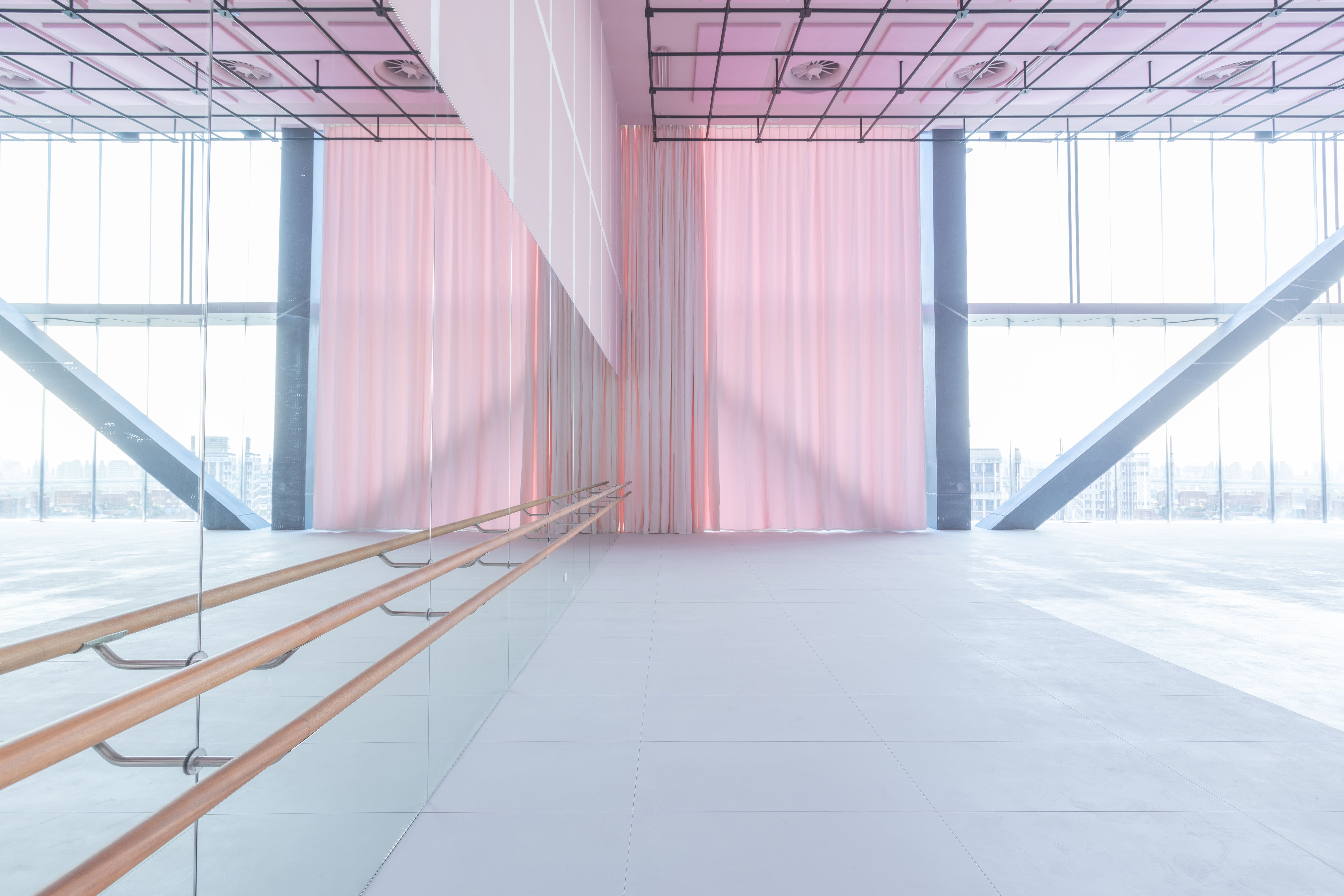 排練場以粉紅色與大面積玻璃設計,通透明亮,象徵藝術家在此孵育作品。