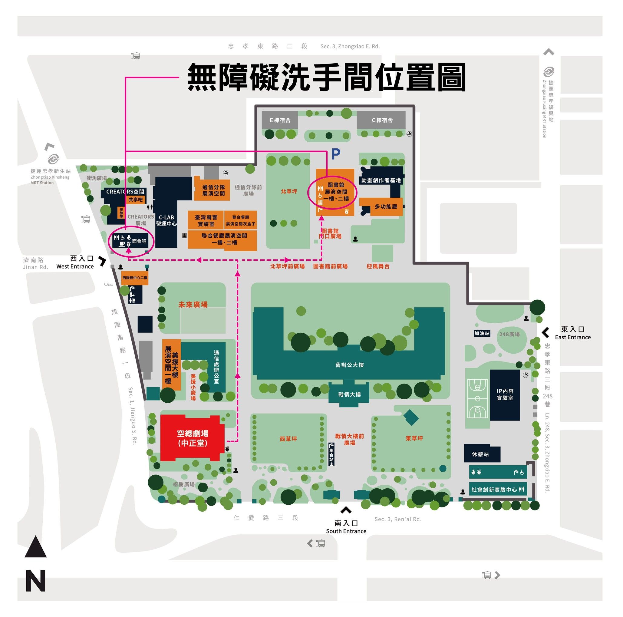 ◇場館內僅提供一般洗手間,無障礙洗手間位於臺灣當代文化實驗場濟南路西入口附近。有使用需求的觀眾,建議提早前往使用。