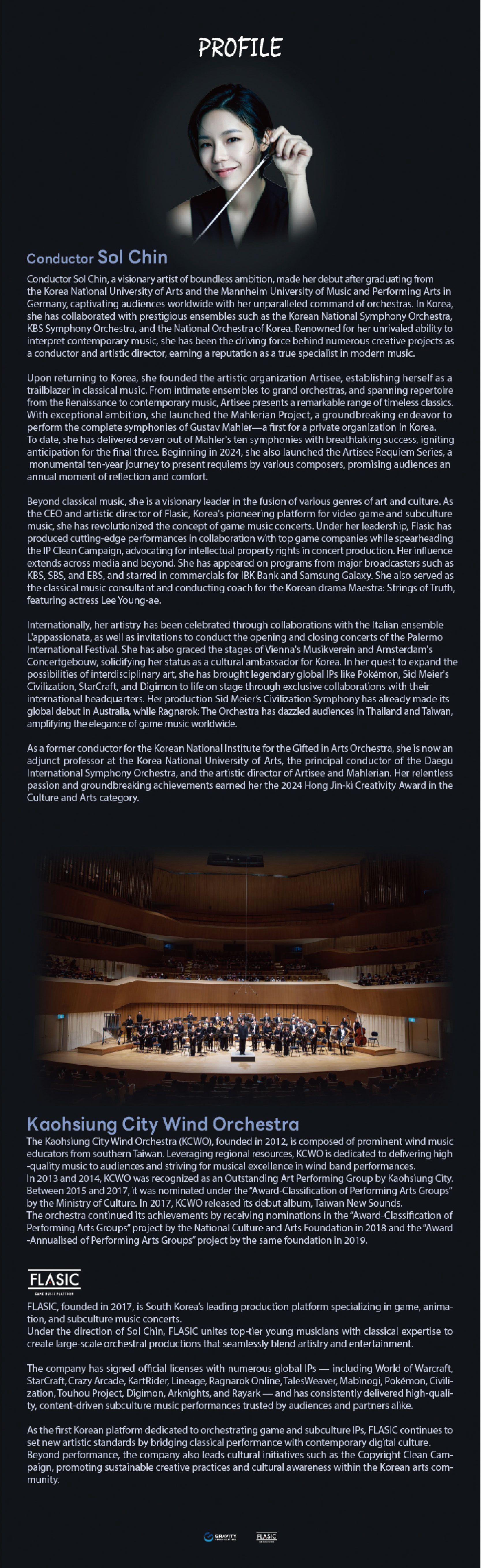 Sol Chin 曾任韓國國立英才教育院管弦樂團指揮,現為韓國藝術綜合學校兼任教授、大邱國際交響樂團首席指揮,以及 Artisee 與 Mahlerian 的藝術總監。憑藉其不懈的熱情與突破性的成就,她榮獲 2024 年洪震基創造人獎(文化藝術類)。 FLASIC FLASIC 成立於 2017 年,是韓國首屈一指的遊戲、動漫及次文化音樂會製作平台。 在指揮家 Sol Chin 的帶領下,FLASIC 匯集了受過嚴格古典音樂訓練的頂尖青年音樂家,打造出融合藝術性與娛樂性的大型管弦樂製作。 公司已與多個全球知名 IP 簽署官方授權,包括《魔獸世界》、《星海爭霸》、《爆爆王》、《跑跑卡丁車》、《天堂》、《RO 仙境傳說》、《天翼之鍊》、《瑪奇》、《寶可夢》、《文明帝國》、《東方 Project》、《數碼寶貝》、《明日方舟》以及雷亞遊戲(Rayark)等。FLASIC 持續製作高品質且內容紮實的次文化音樂演出,深受觀眾與合作夥伴信賴。 作為韓國首個致力於改編遊戲與次文化 IP 的平台,FLASIC 透過連結古典演奏與當代數位文化,樹立了新的藝術標竿。 除演出製作外,該公司也致力於文化倡議,推動「版權潔淨運動(Copyright Clean Campaign)」,在韓國藝術界推廣永續創作與正版授權的觀念。